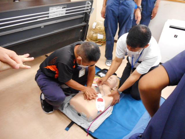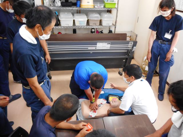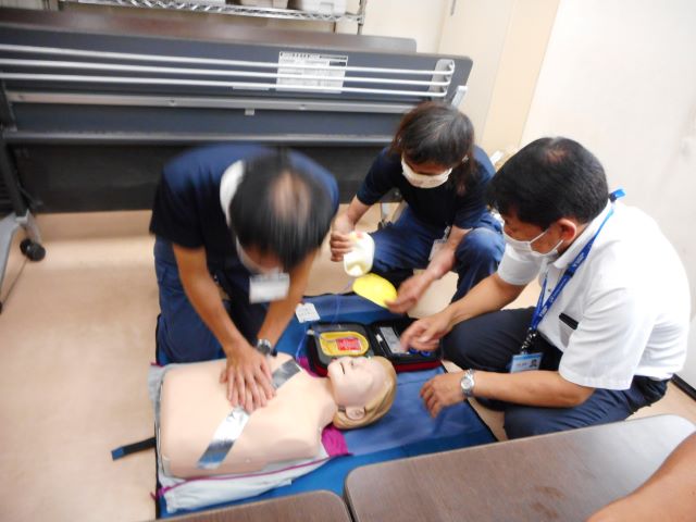 AED講座を行いました。 6月17日に講師の方を招き、AED講習を行いました。 今年で5回目ですが、ご利用者の中には初めて講習を受けるという方もいました。 初めての方たちには、人形を使い心臓マッサージの練習を行ってもらいました。 皆さん始めは、手の位置や、力加減が難しい様子でしたが、講師の方の話を聞き再度取り組むと、上手に出来ていました。また、今後も訓練を続けていきたいと思います。