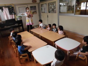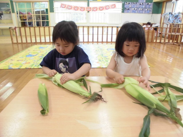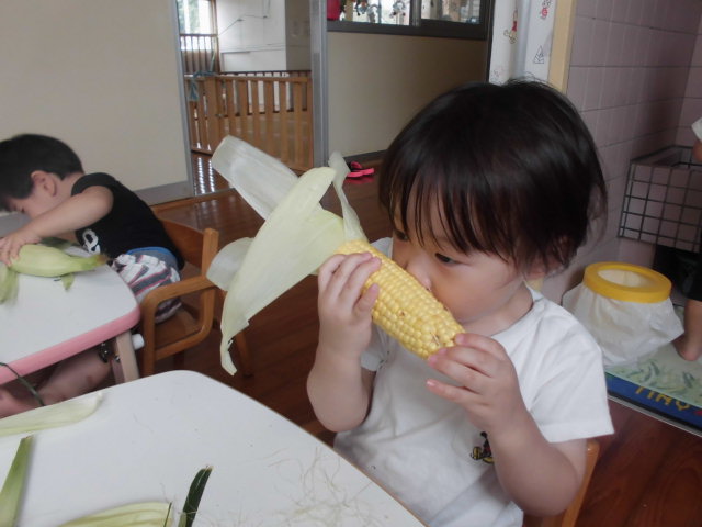 そして・・・・・今月のおやつのゆでとうもろこし。保育園では毎年子ども達がとうもろこしの皮むきをします。皮むきも指先や手の力が必要で、「ん~~!!」と力を込めて皮をむく表情は真剣そのもの!お友達と皮を引っ張り合いっこしたり、とうもろこしのひげで遊ぶ子どももいました。