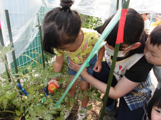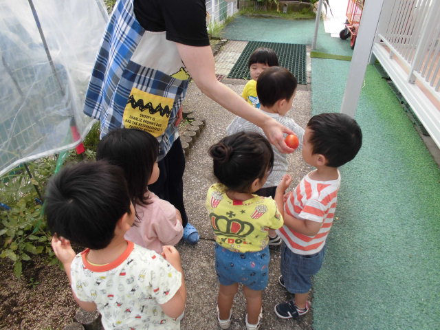 4月に植えたトマトが赤く実り、記念すべき1個を収穫しました。まだかなぁ~と収穫する日を楽しみにしていたので、子ども達は大喜び♪ 給食の時に切って少しずつ食べました。普段、苦手で食べない子どもも「みんなが育てているトマトだよ。」と伝えるとなんと全員完食!!やっぱり、自分達で作ったトマトの味は格別だったかな?どんどん色づいてくるトマト、今年はどのくらい収穫できるか楽しみです♡