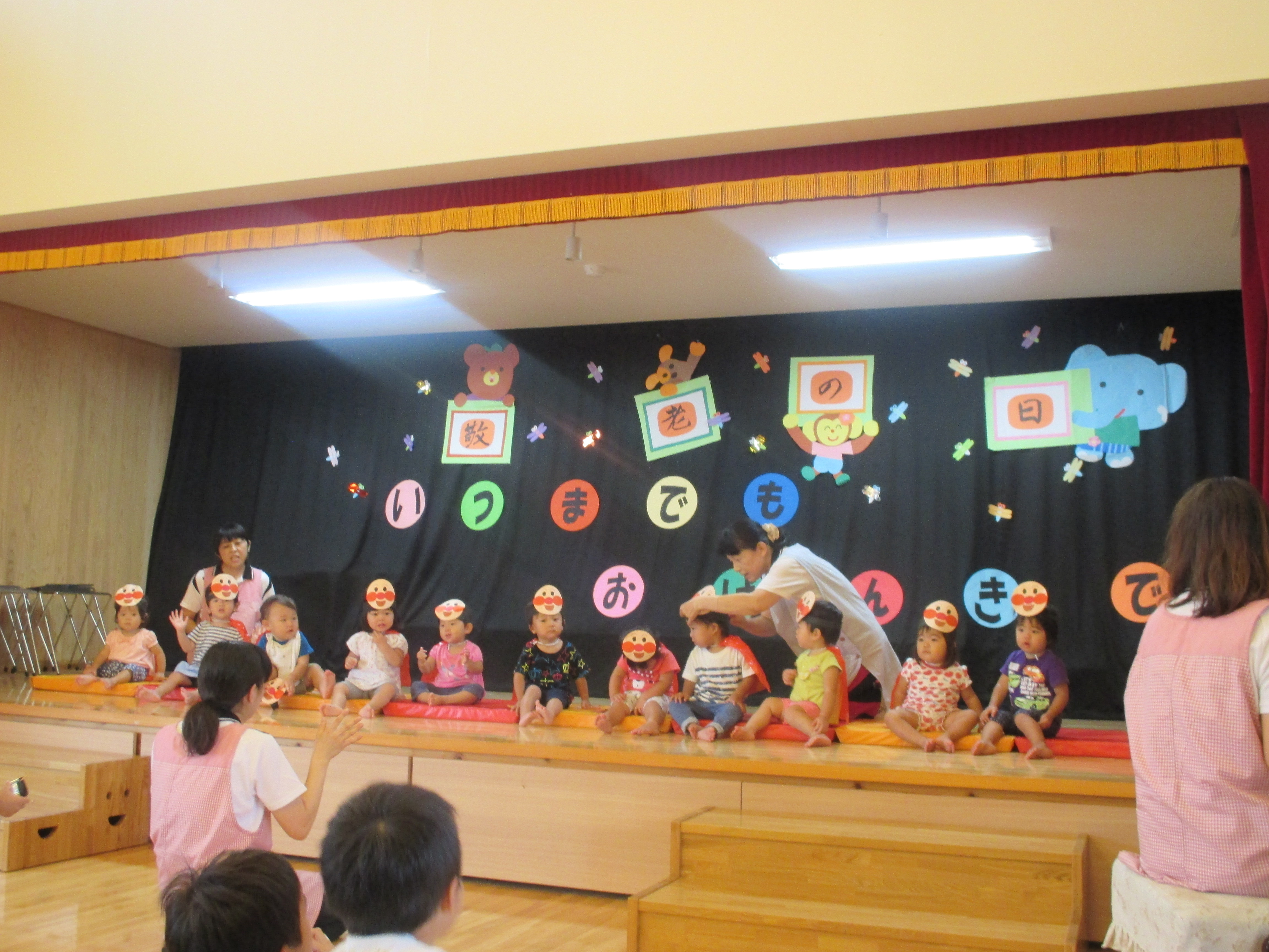 敬老会 9月15日(金) 待ちに待った敬老会。おじいちゃんとおばあちゃんが保育園に来てくれるのを楽しみにしていた子ども達。 手遊びやお遊戯を見てもらい、その後は各クラスに分かれてスキンシップ遊びやプレゼントを渡したりと日頃の感謝の気持ちを言葉で伝えた子ども達もいました。 いつまでも元気でいて下さいね。
