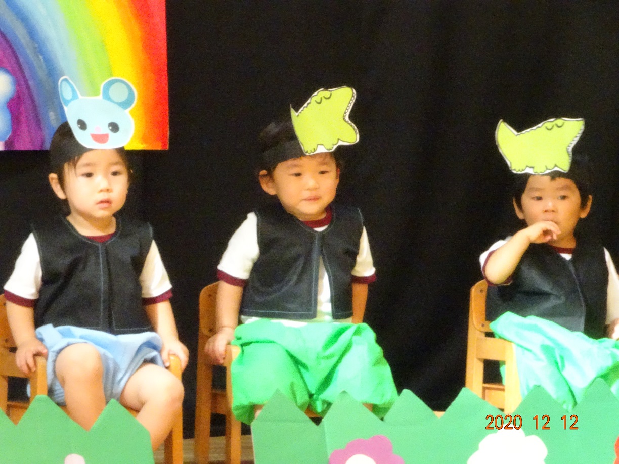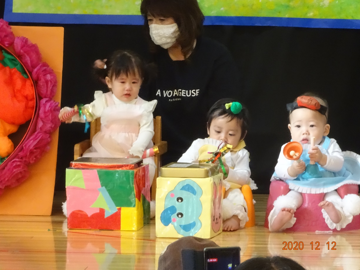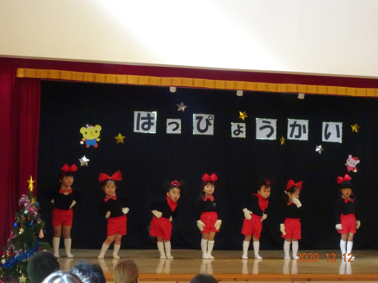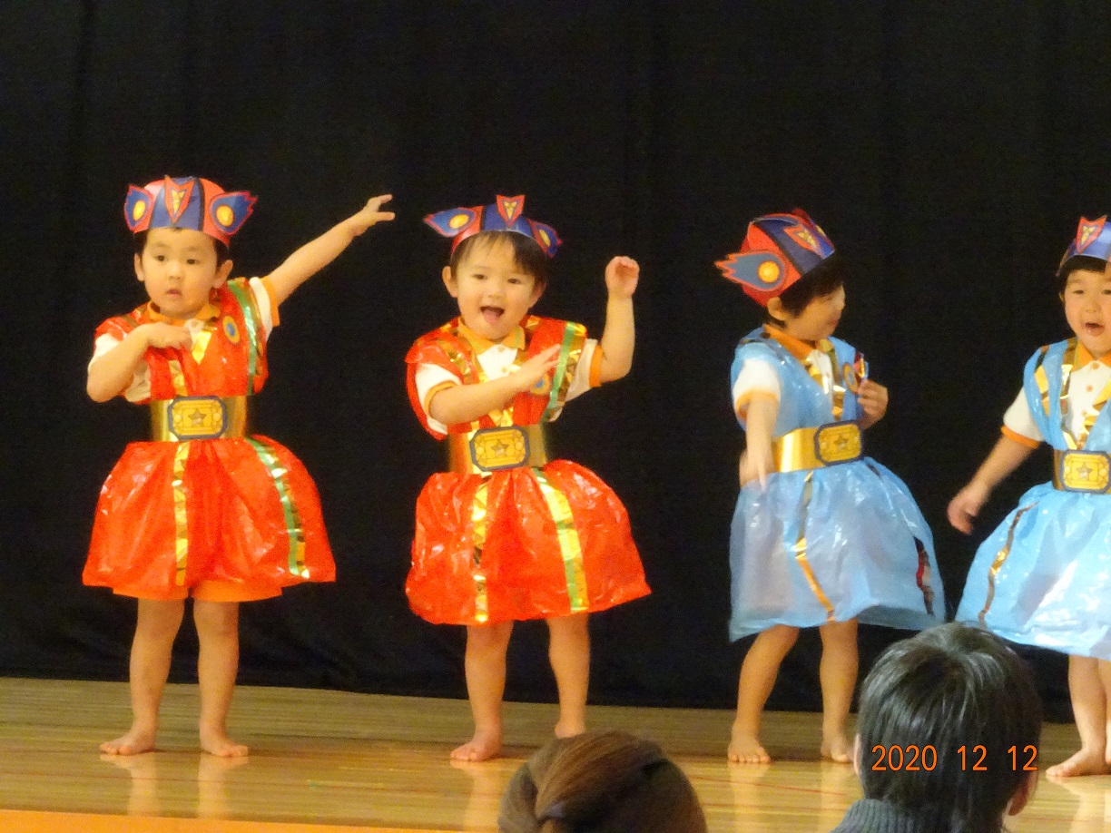 クリスマス発表会(未満児) 12月12日(土) 今年度の発表会は、新型コロナウイルス感染症のこともあり未満児クラス、以上児クラス 別々の日に開催することになりました。 今日は未満児クラス♬ とってもかわいい姿でその場にいるだけでもホッコリ(^^♪ また、クラスが上がるにつれ動きもしっかりして堂々とした姿をみせてくれました。