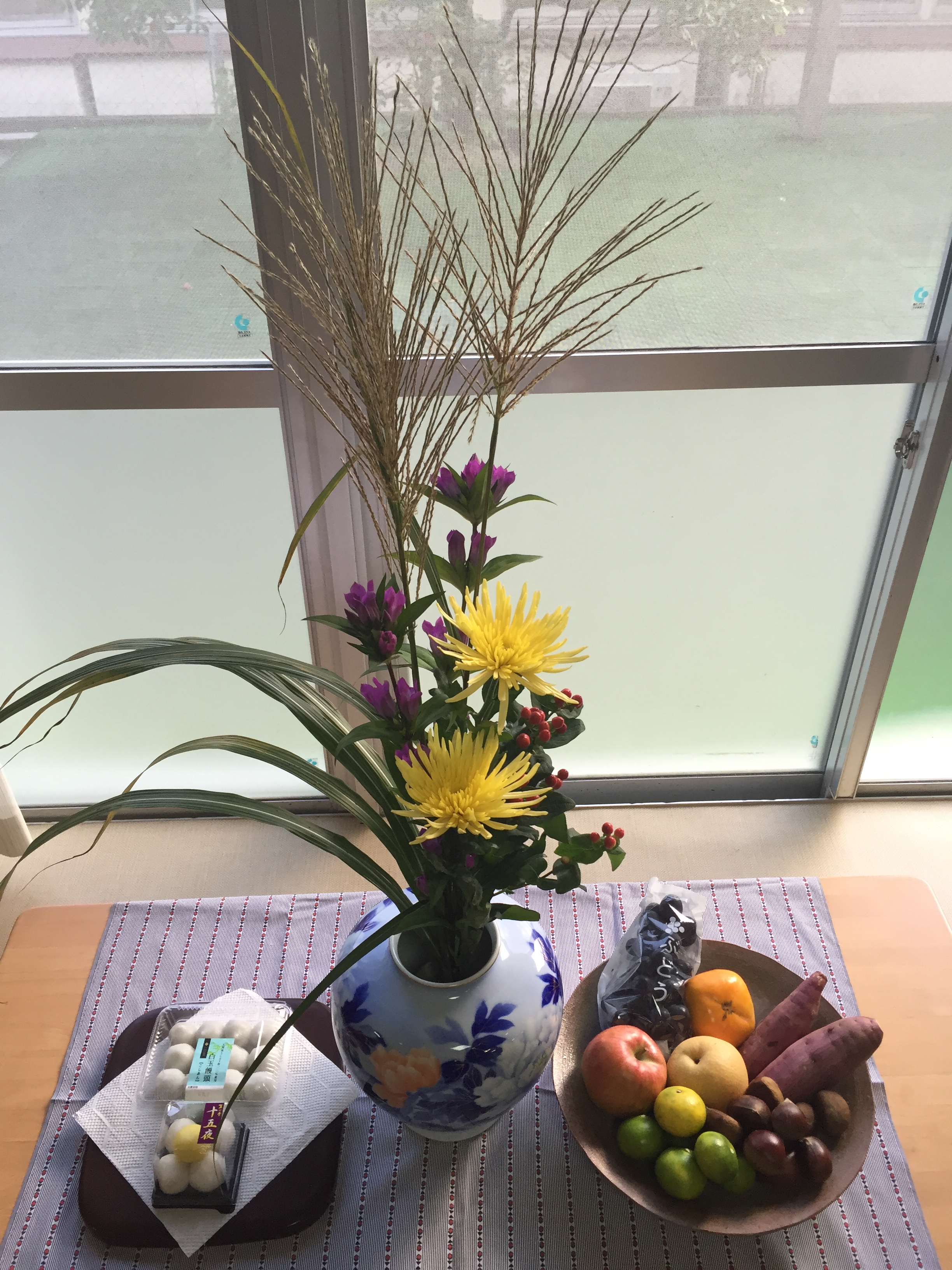 ★☆★ 中秋の名月 ★☆★ 今年の十五夜(中秋の名月)は、9月15日。 あすなろの里のロビーに、十五夜のお供え物を飾りました。 さっきまで空は曇りでしたが、少し天気が回復してきました…。 大きく、きれいな満月を入所ご利用者の皆さん、楽しみにされています!