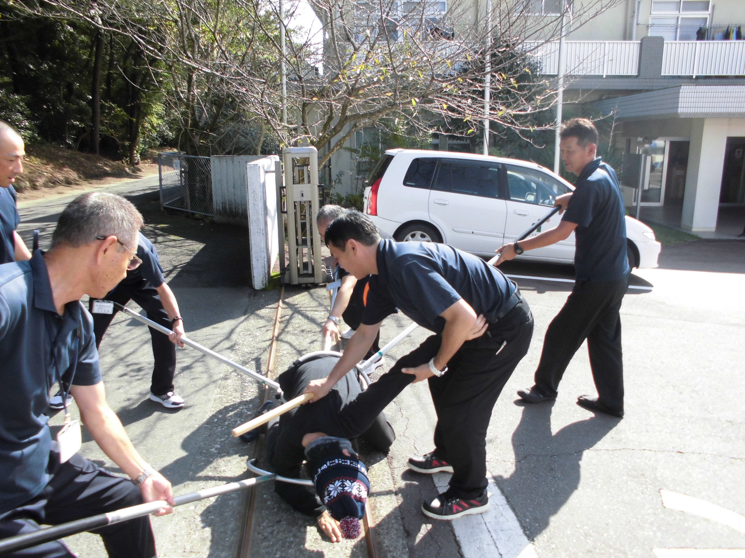 (数名の職員で、さすまたを用いて不審者を取り押さえました)