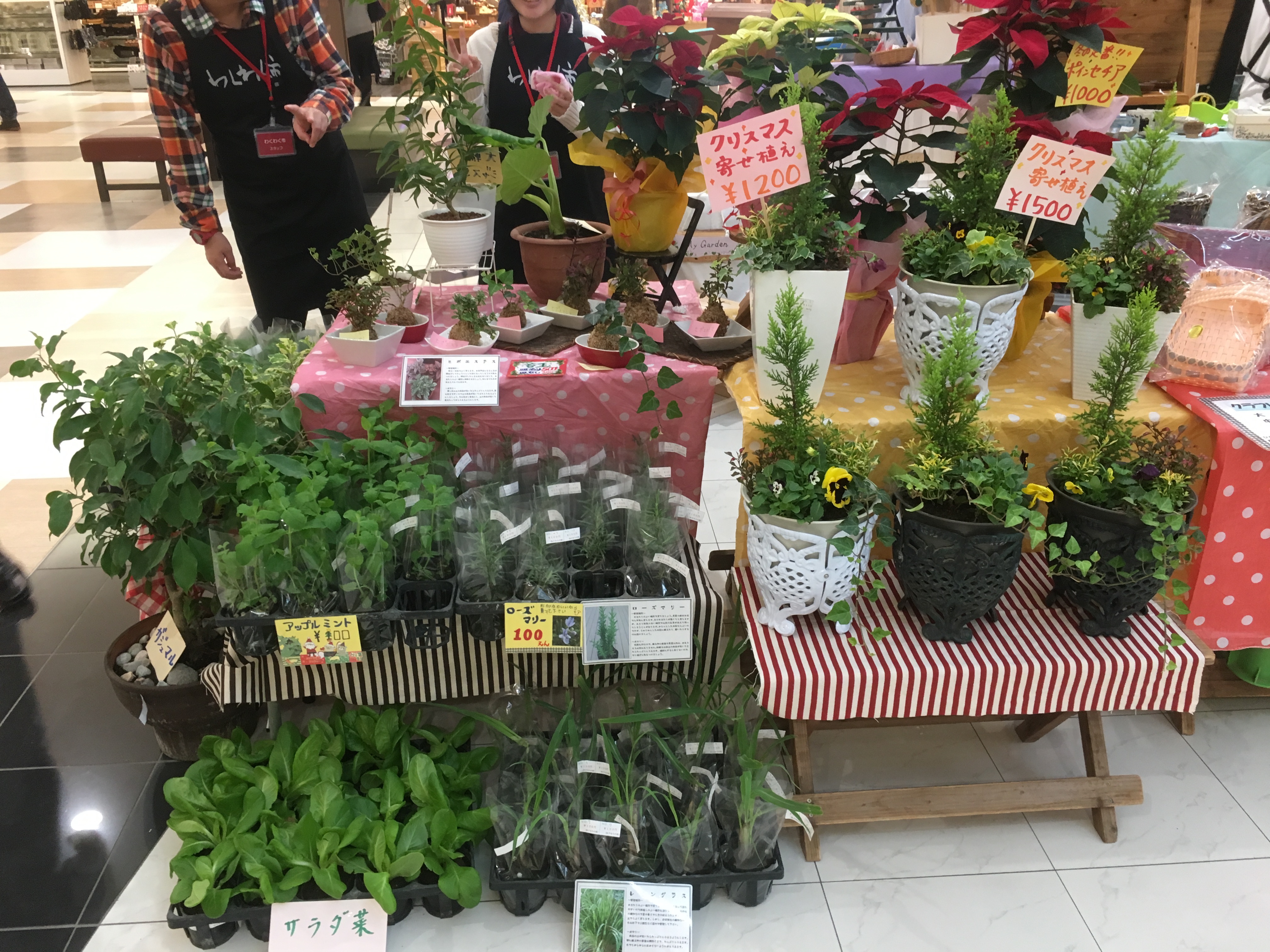 11月の♪わくわく市♪ 1 販売名 福祉バザールわくわく市 ※ 他の福祉施設との合同販売です。 2 開催日 平成28年11月24日(木)~27日(日) 3 時 間 10時00分~19時00分 ※最終日27日は18時00分まで 4 場 所 イオン宮崎 5 出店品 観葉植物、寄せ植え、野菜、ハーブ苗、ハーブ石鹸、オリジナル雑貨など 今回はクリスマス寄せ植えも販売しております。 ハーブ類は5種類そろえております。 雑貨等の商品も多数そろえておりますのでぜひお越しください。