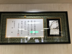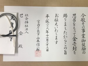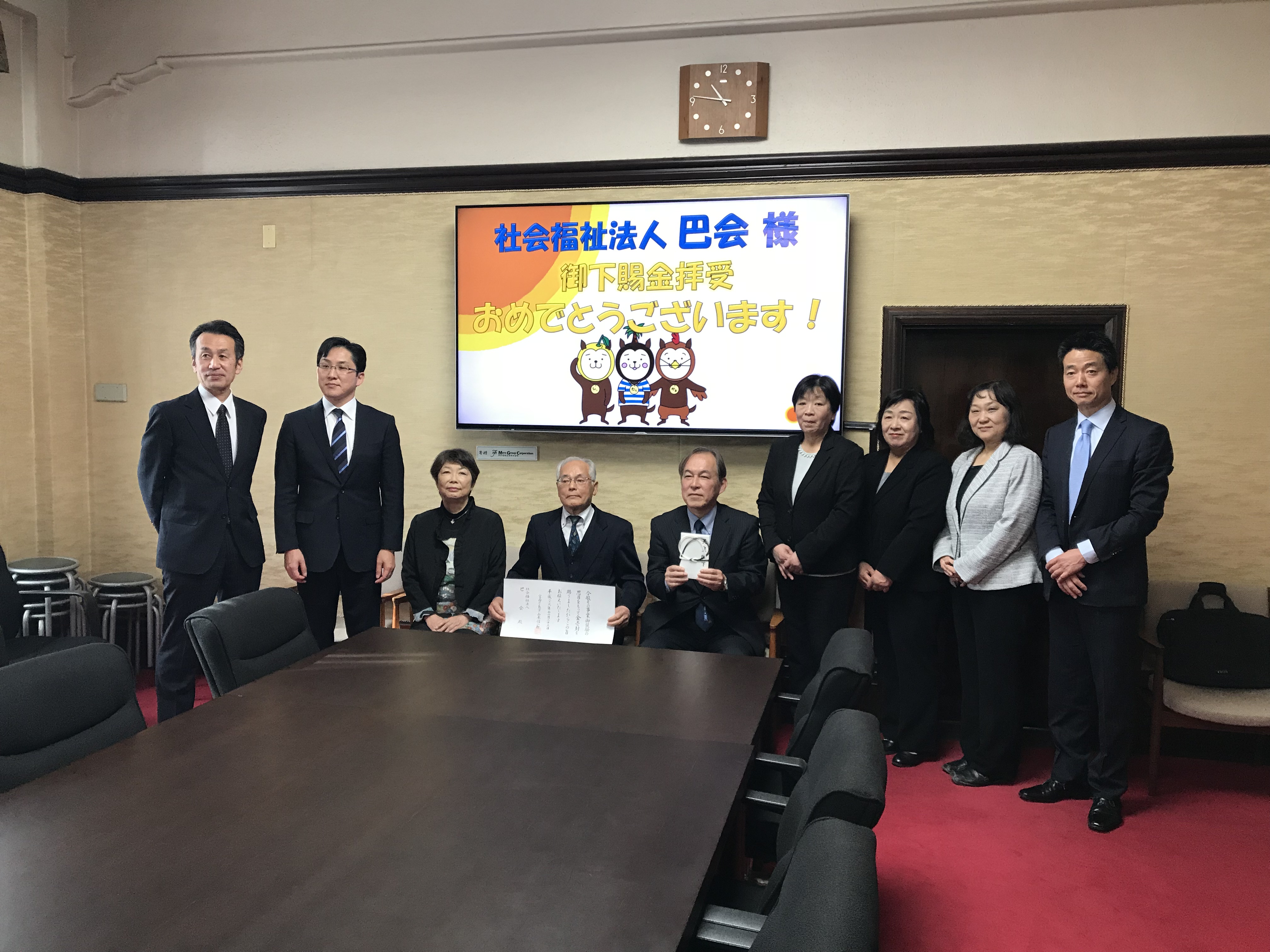 御下賜金伝達式 このたび、天皇陛下より社会福祉法人巴会に対して御下賜金(ごかしきん)を賜りました。 「御下賜金伝達式」が平成29年12月22日(金)10時30分から宮崎県庁知事室において執り行われ、理事長、常務理事、法人本部、各施設長が出席し、河野知事より長友理事長が伝達書、河野常務理事が御下賜金を拝受いたしました。 社会福祉法人巴会は、今年創立40周年を迎えましたが、この記念すべき年にこのような名誉を得ましたことは、大きな喜びであり、創立50周年へ向けての一層の励みになりました。