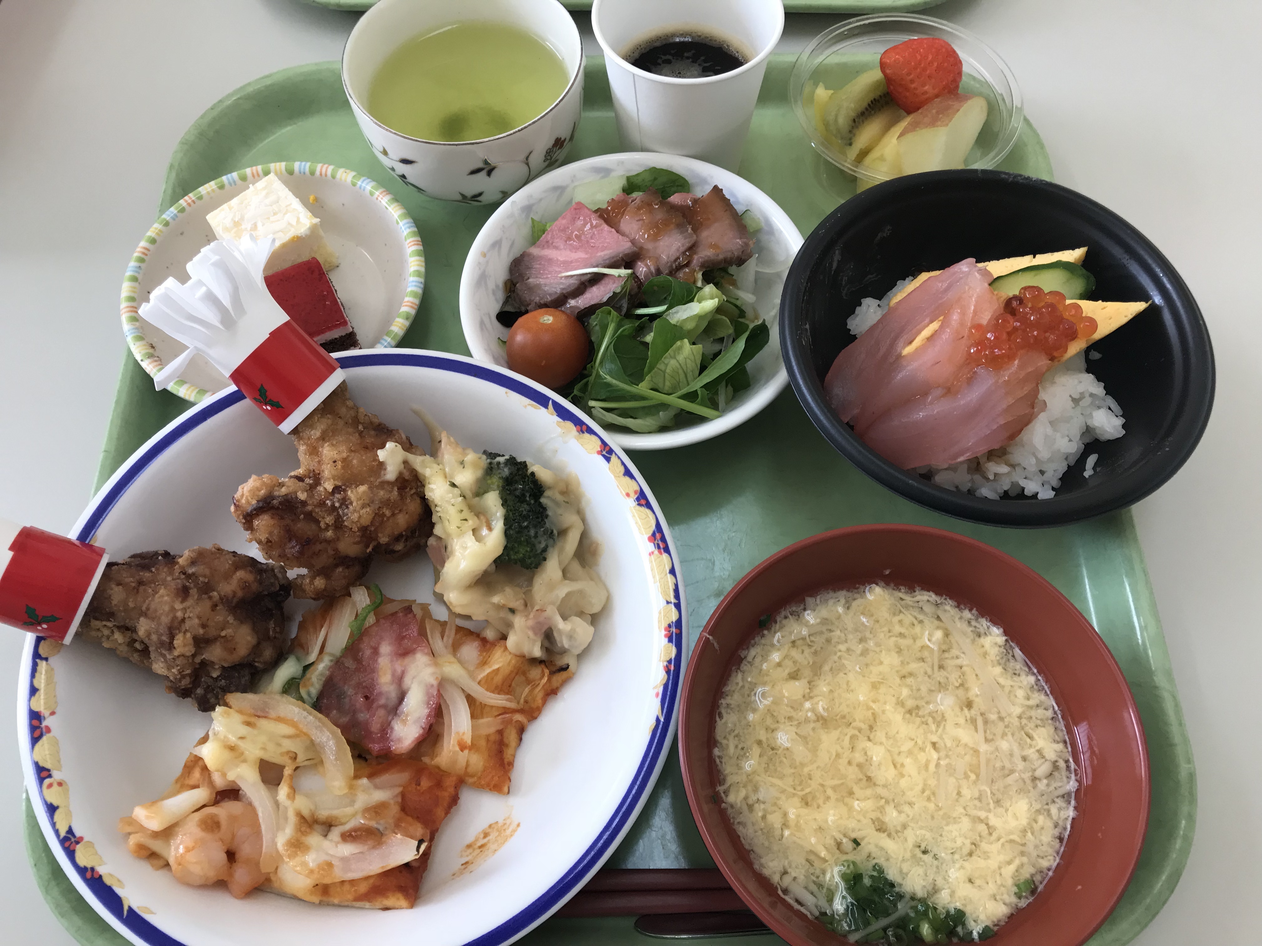 ♪クリスマスバイキング♪ 12月25日(月)の昼食は、皆さんお待ちかねの「クリスマスバイキング」でした。 『チキンドラムスティック、ローストビーフ&サラダ、サラミピザ、シーフードピザ、海鮮丼、グラタン、かき玉汁、フルーツ盛り合わせ、ケーキ2種、コーヒー』を堪能しました。 皆さんおかわりをたくさんされ、味もボリュームも大満足なクリスマスバイキングとなりました!