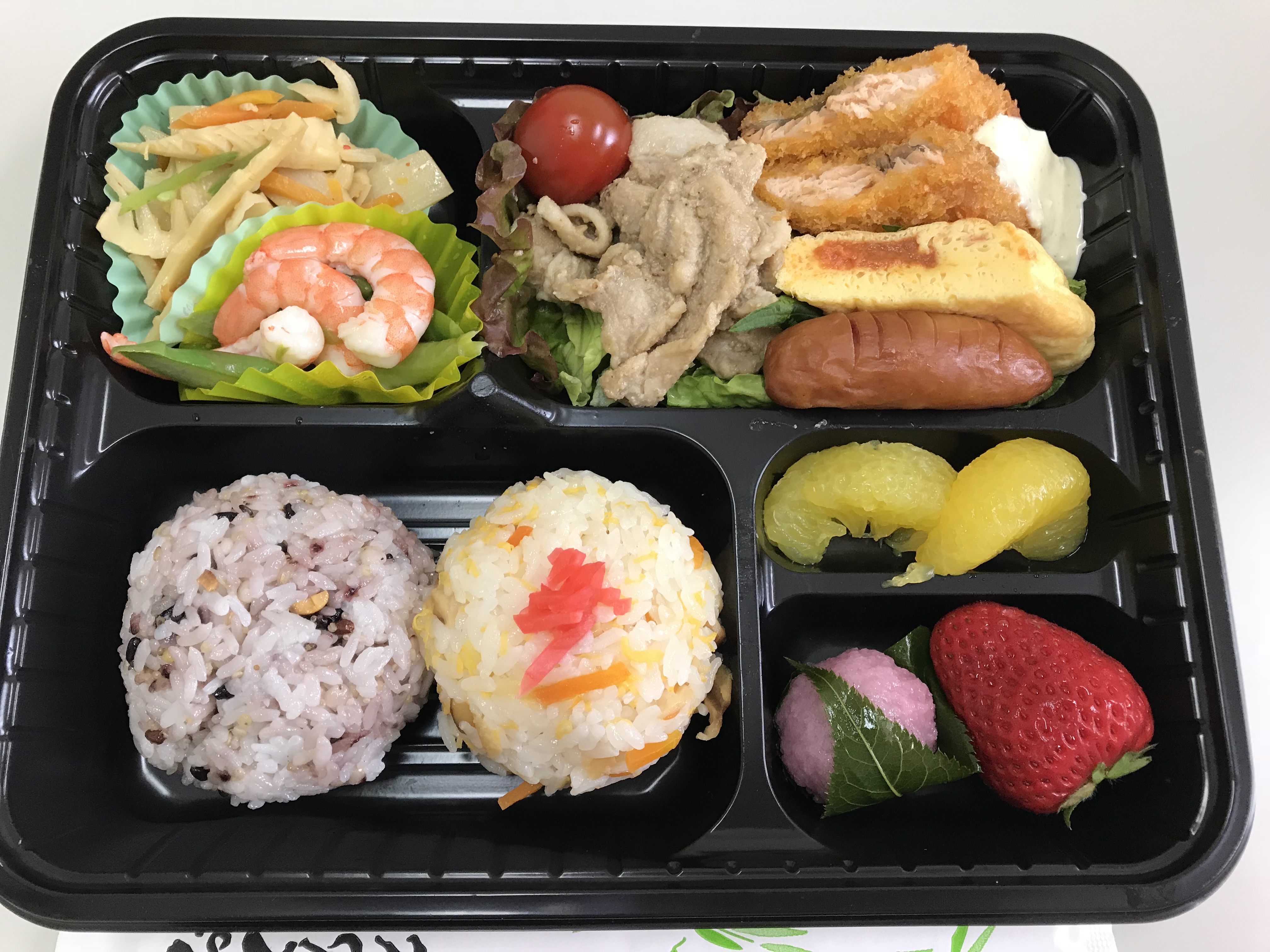 ❀お❀花❀見❀弁❀当❀ 4月6日(金)は、近くのフローランテ宮崎まで花見に行く予定でした。 ですが、あいにくの雨によって、中止となってしまいました。 なんと、4年連続……⤵ なぜか、この日は雨になるのです。 しかし、あすなろの里名物ともなっている給食係の手作り弁当が春の訪れを届けてくれました。