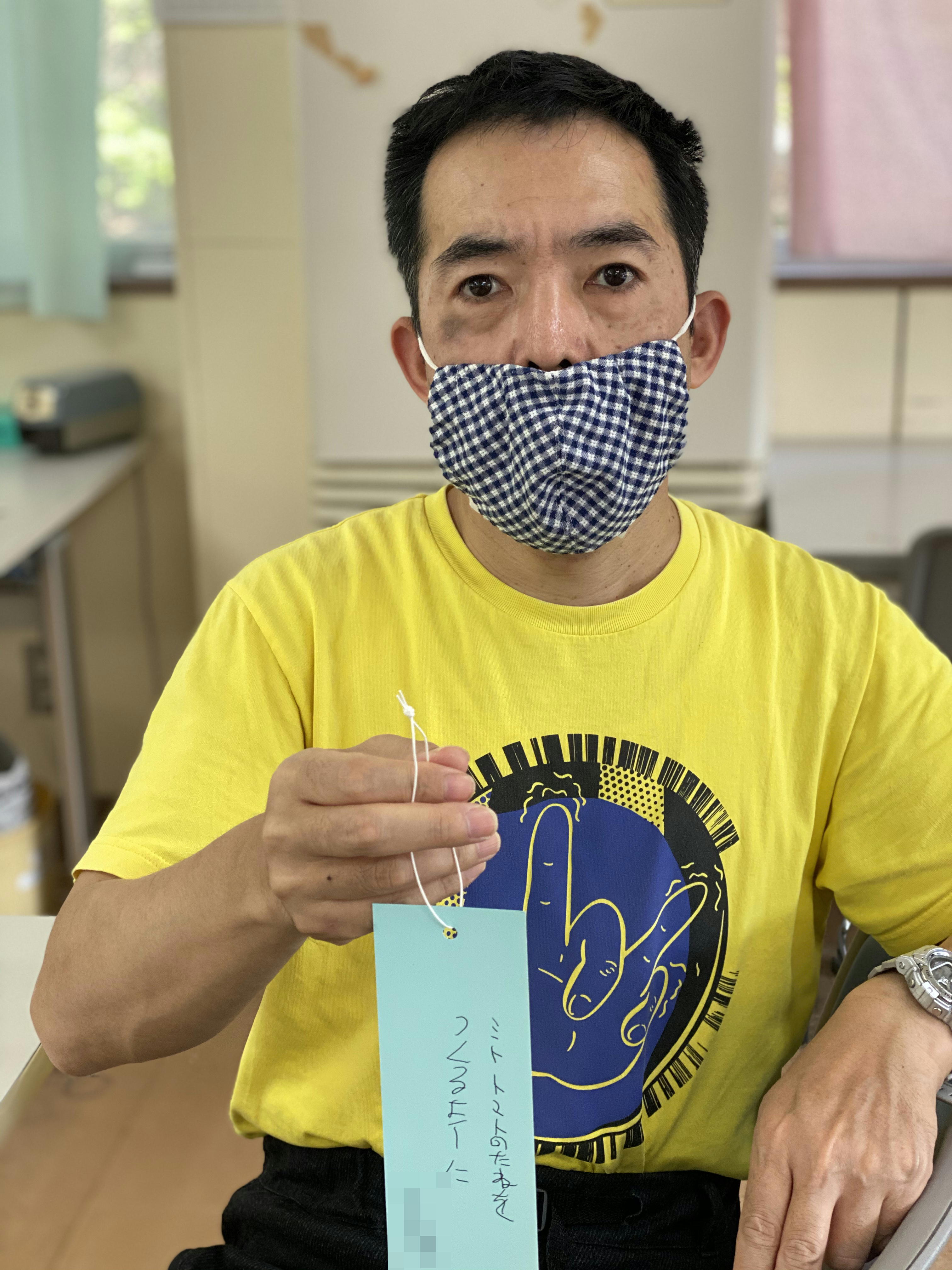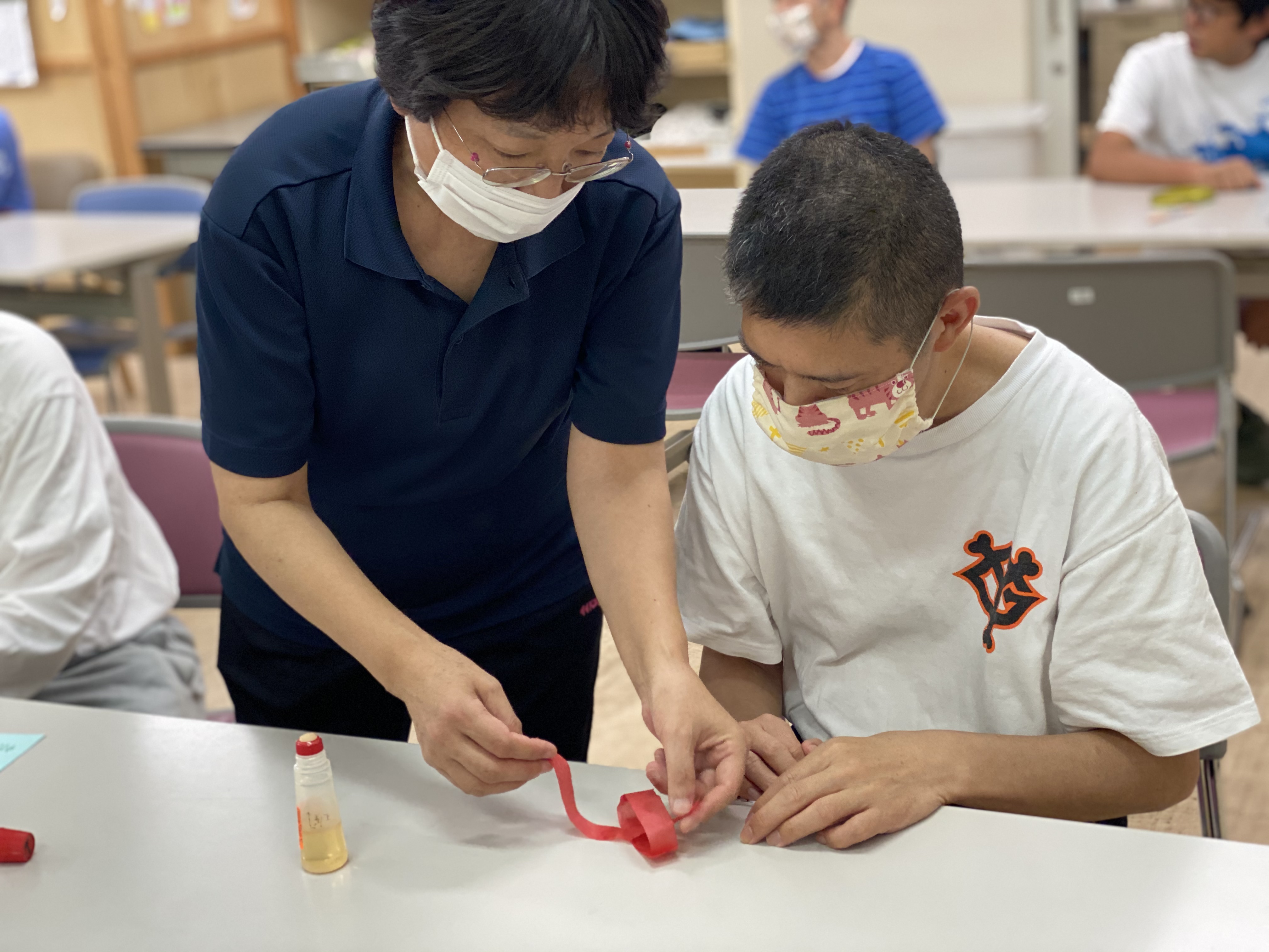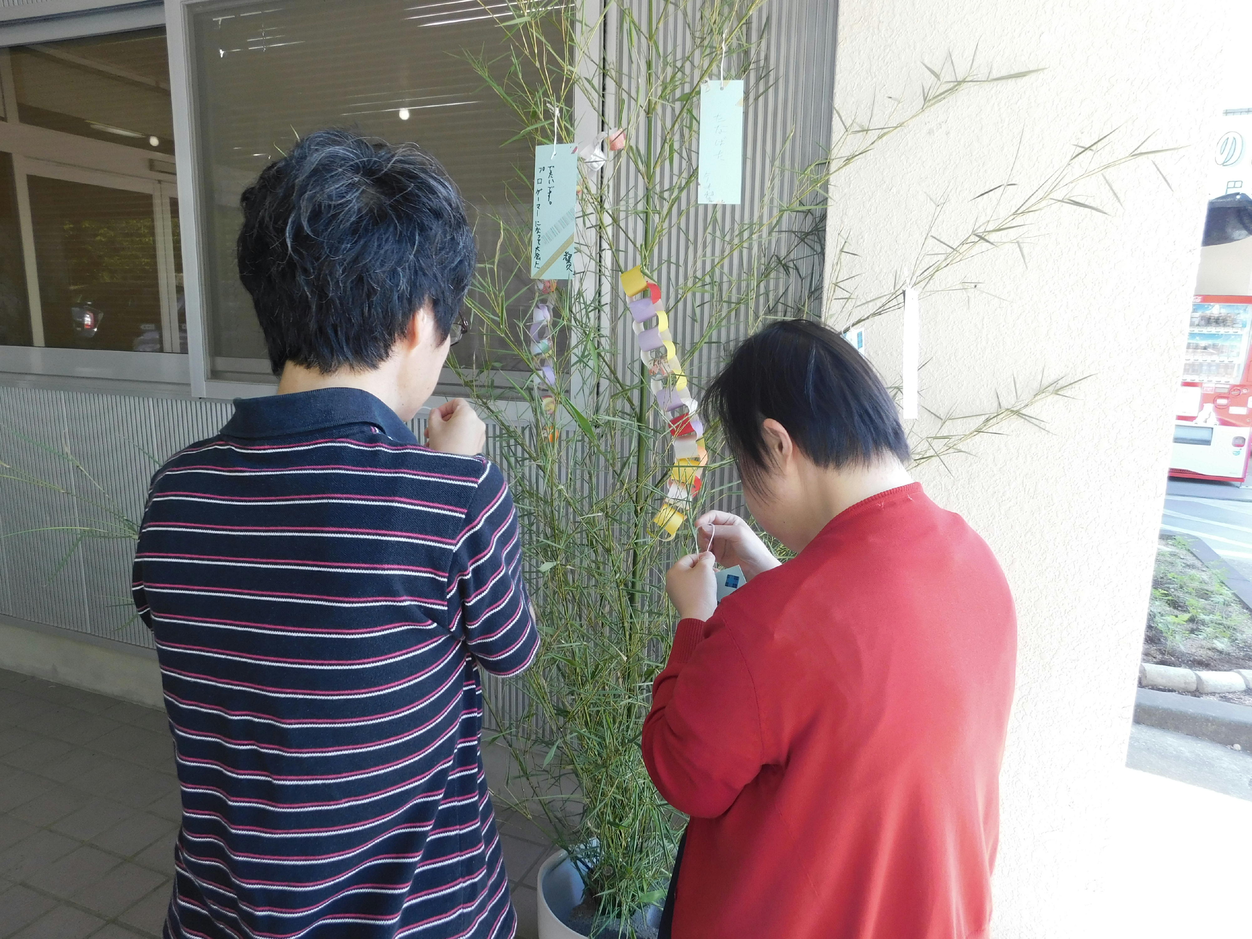 7月 七夕短冊作り 7月7日(火)は七夕ですね♬ 介護支援課の創作活動の一環として、 七夕の短冊作りをしました! 真剣に飾りを作っている様子です。 みなさまそれぞれに、素敵な願いごとを書かれていましたよ♪ 笹に飾りなどをつけて、玄関に飾っている様子です。 素敵な笹に仕上がりました♪ 現在、私たちの生活も何かと制限されることが多い状況ですが、 1日も早いコロナウイルス感染症の終息や、豪雨被害の復興を願い、 日々健康で楽しく過ごしていきましょうね!