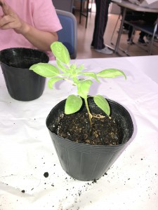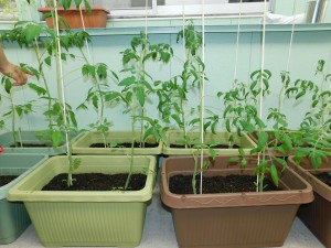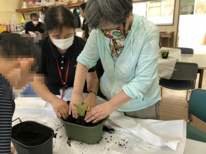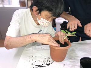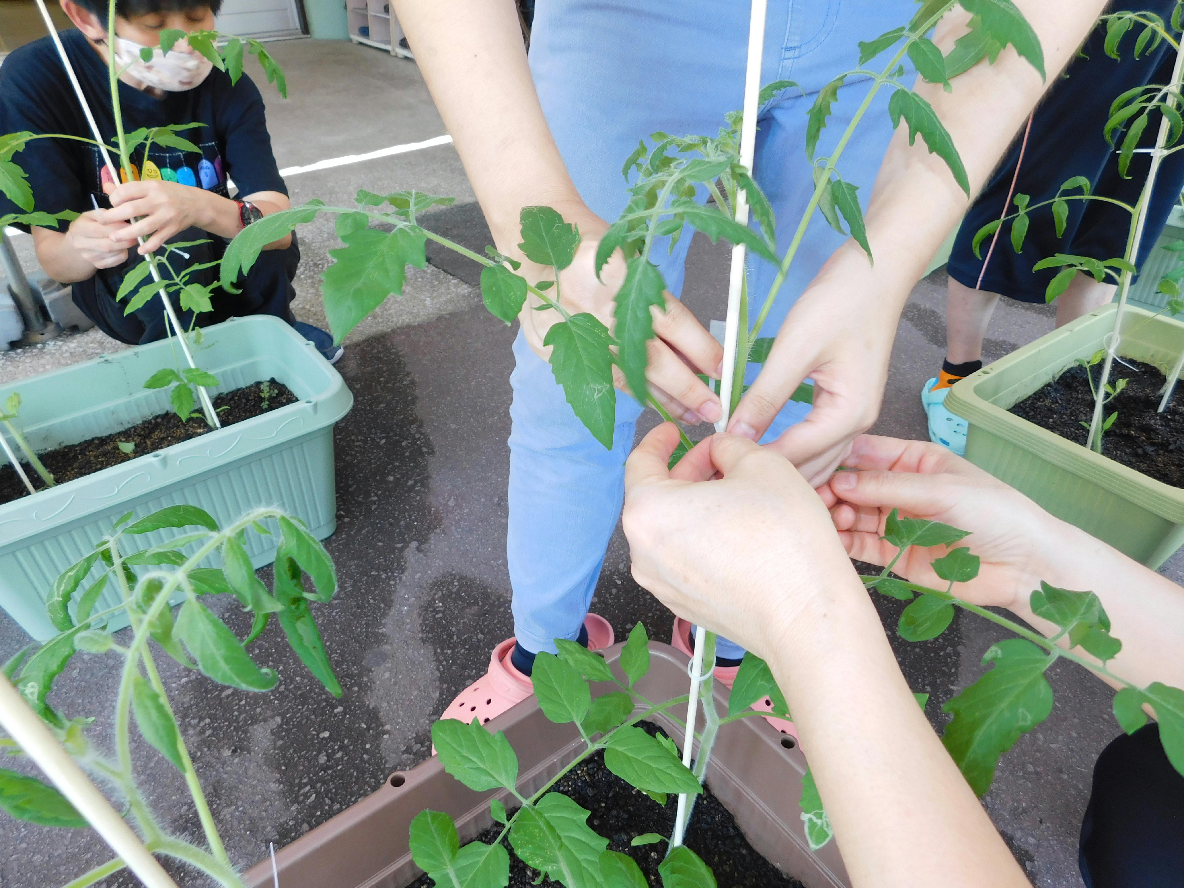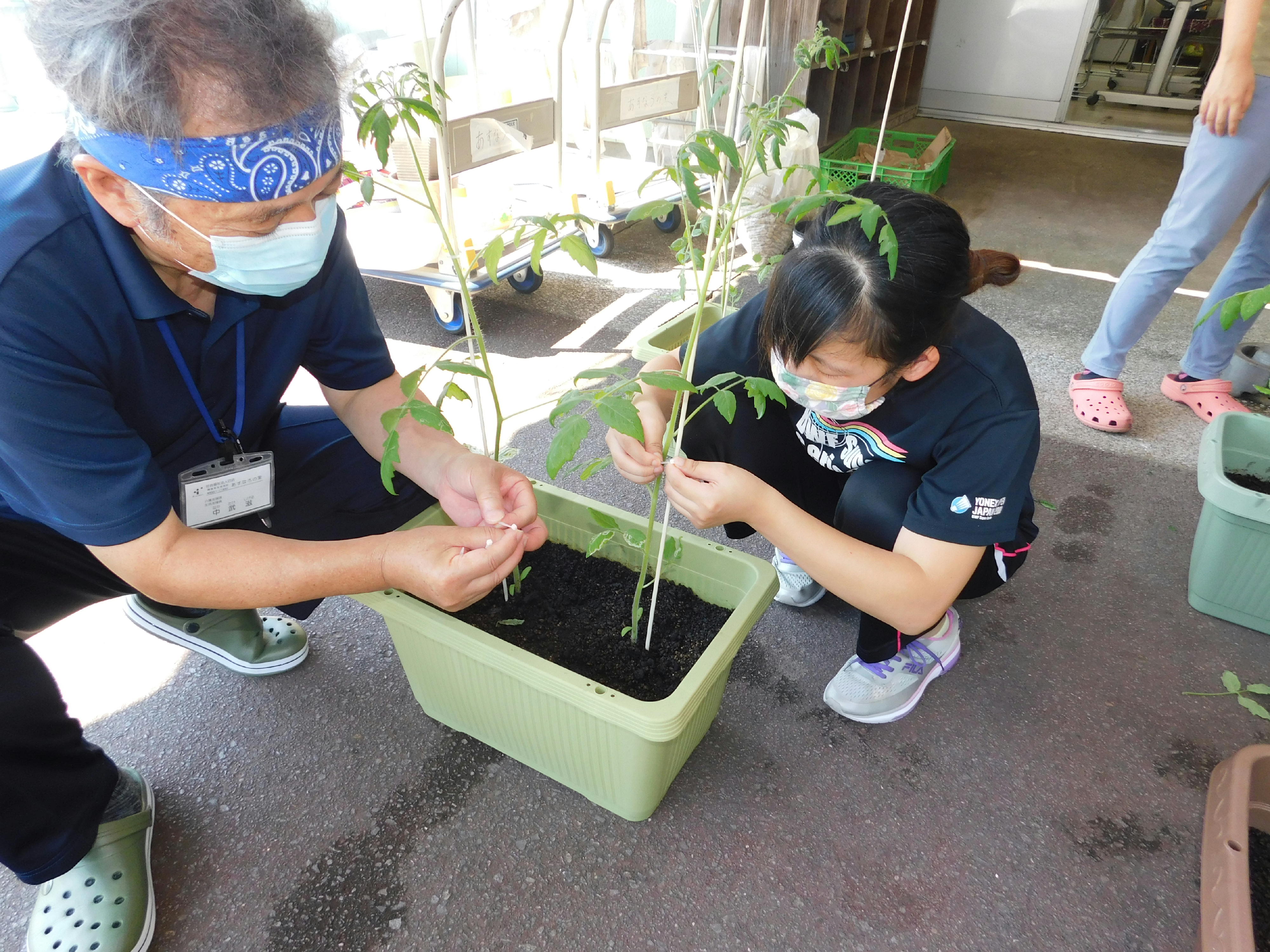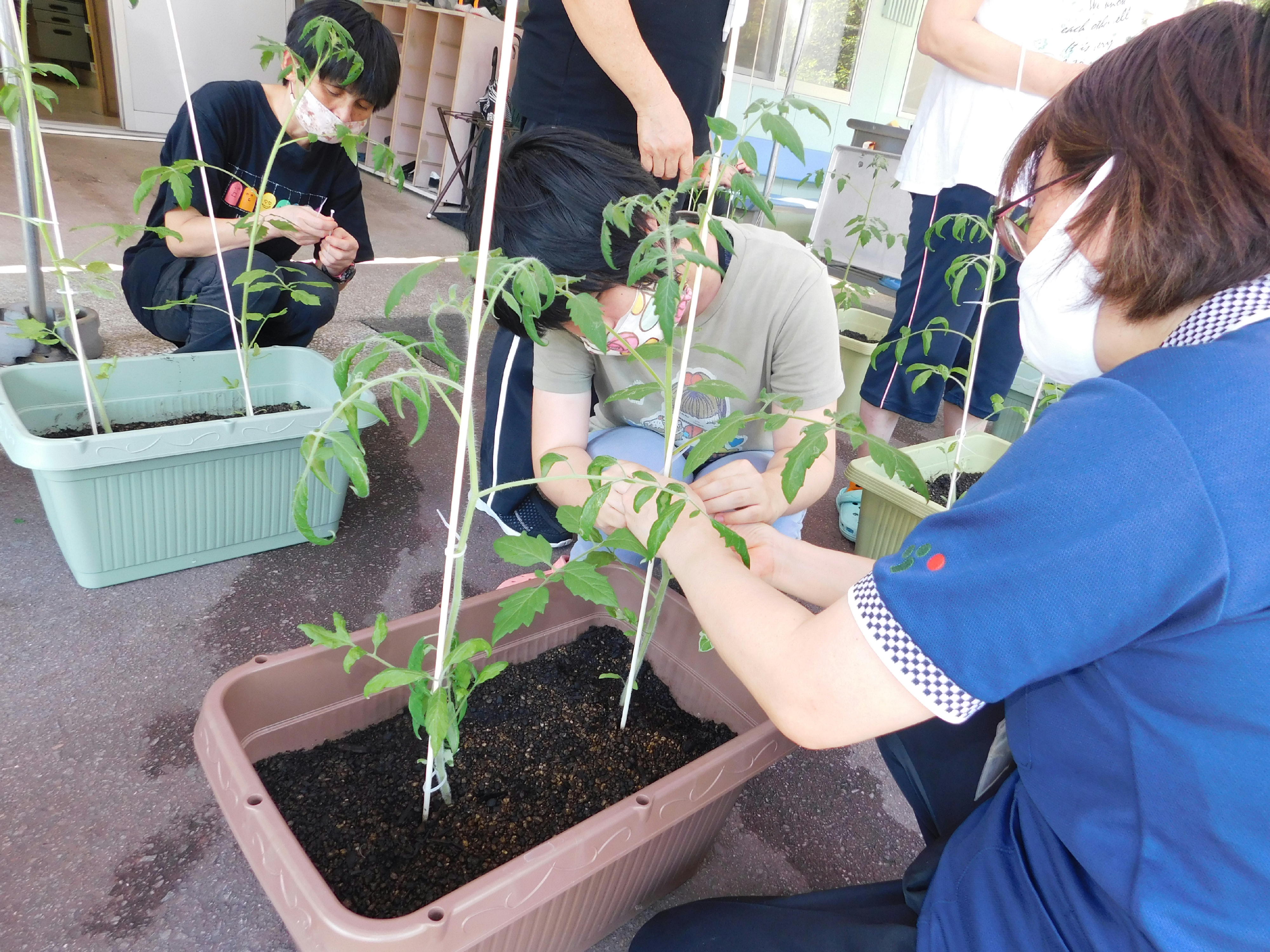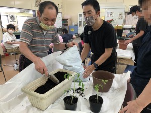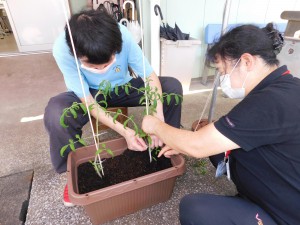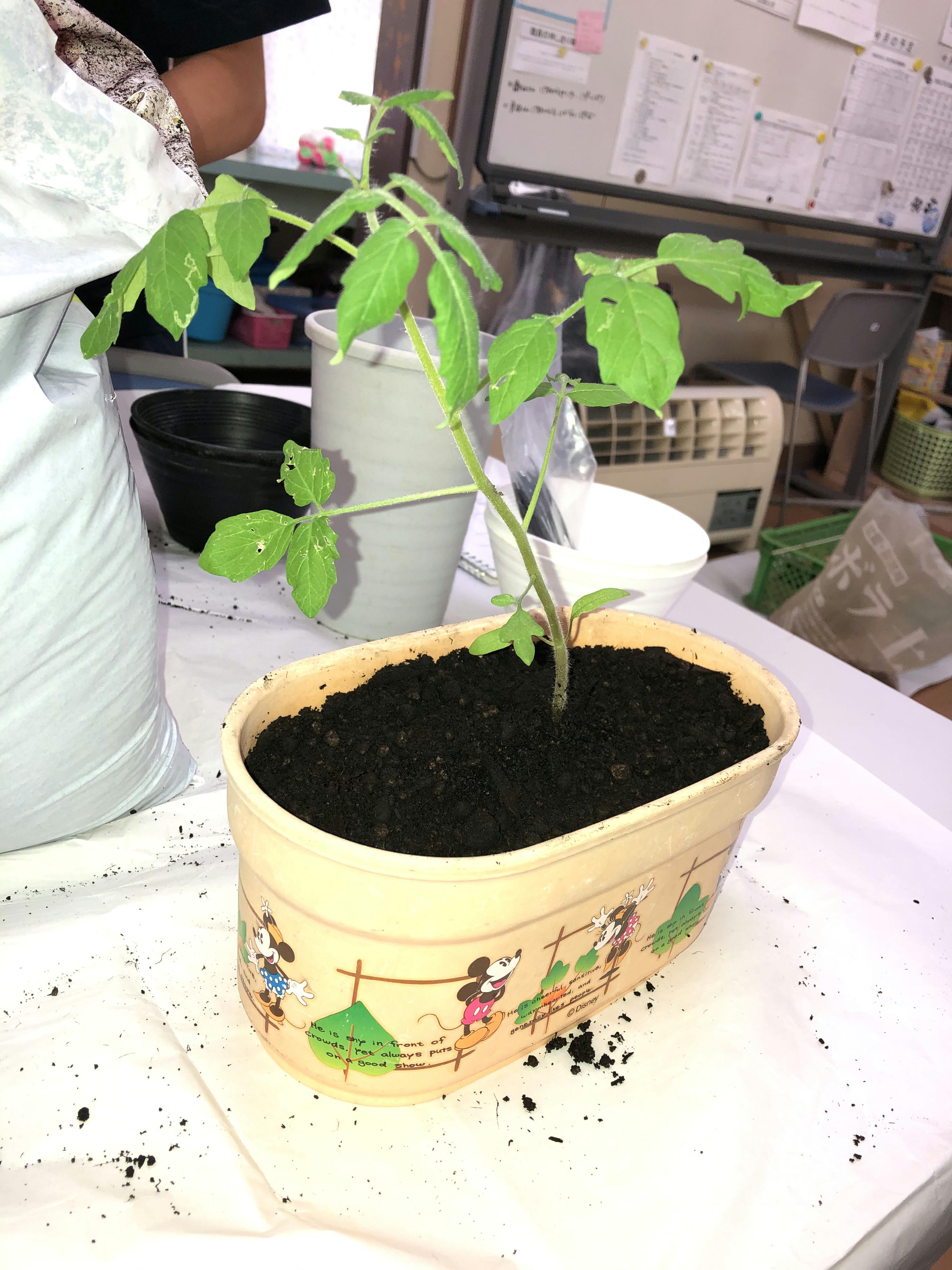 ひまわりとトマトの苗を、プランターに移す作業をしました。