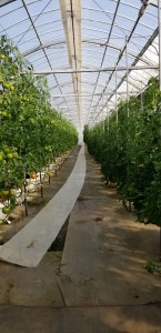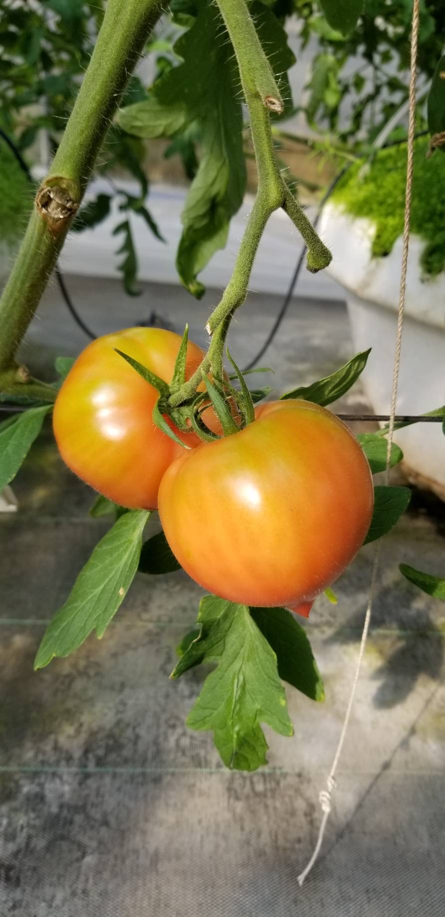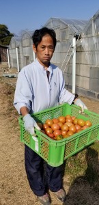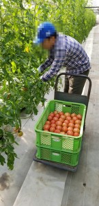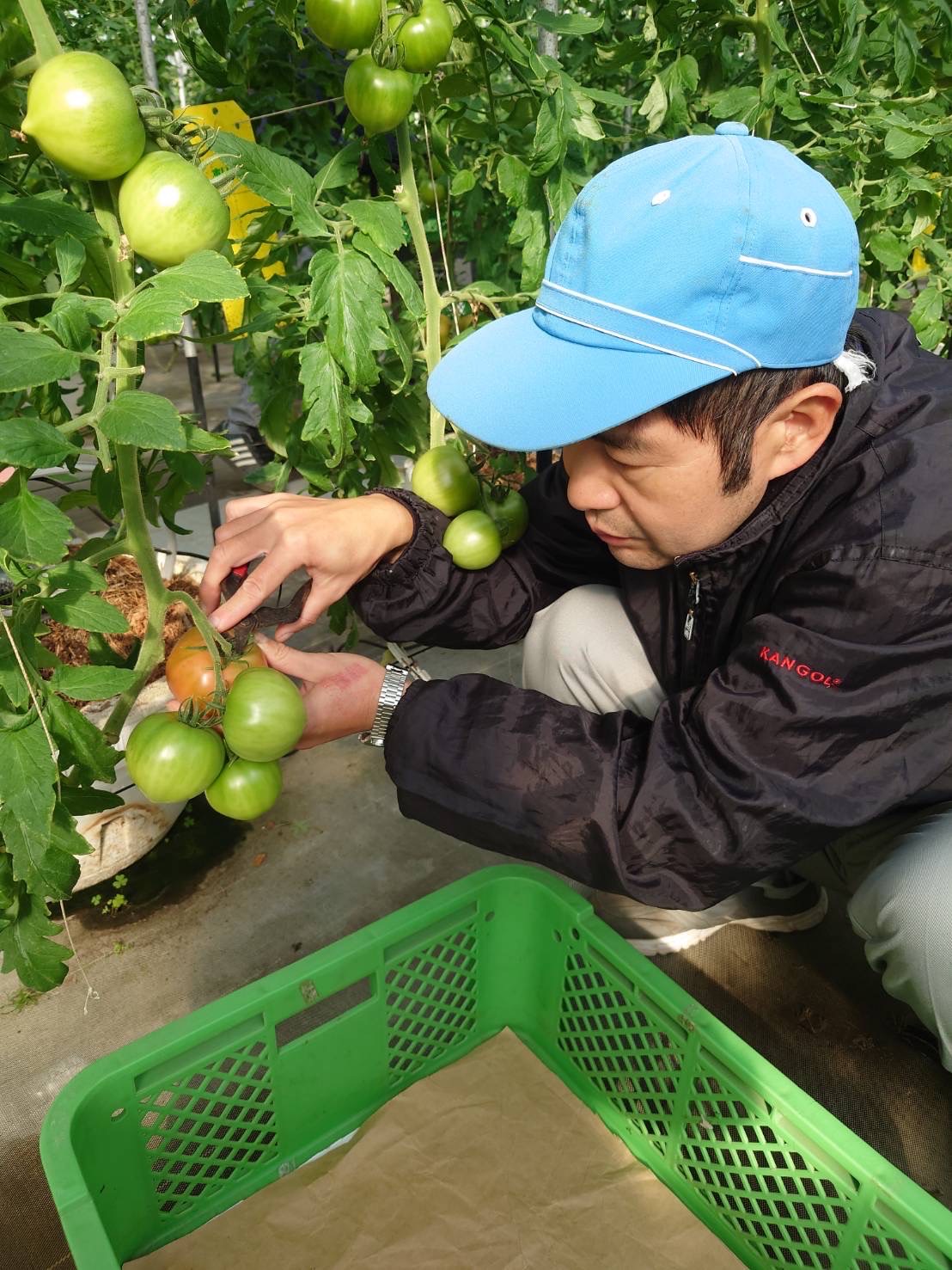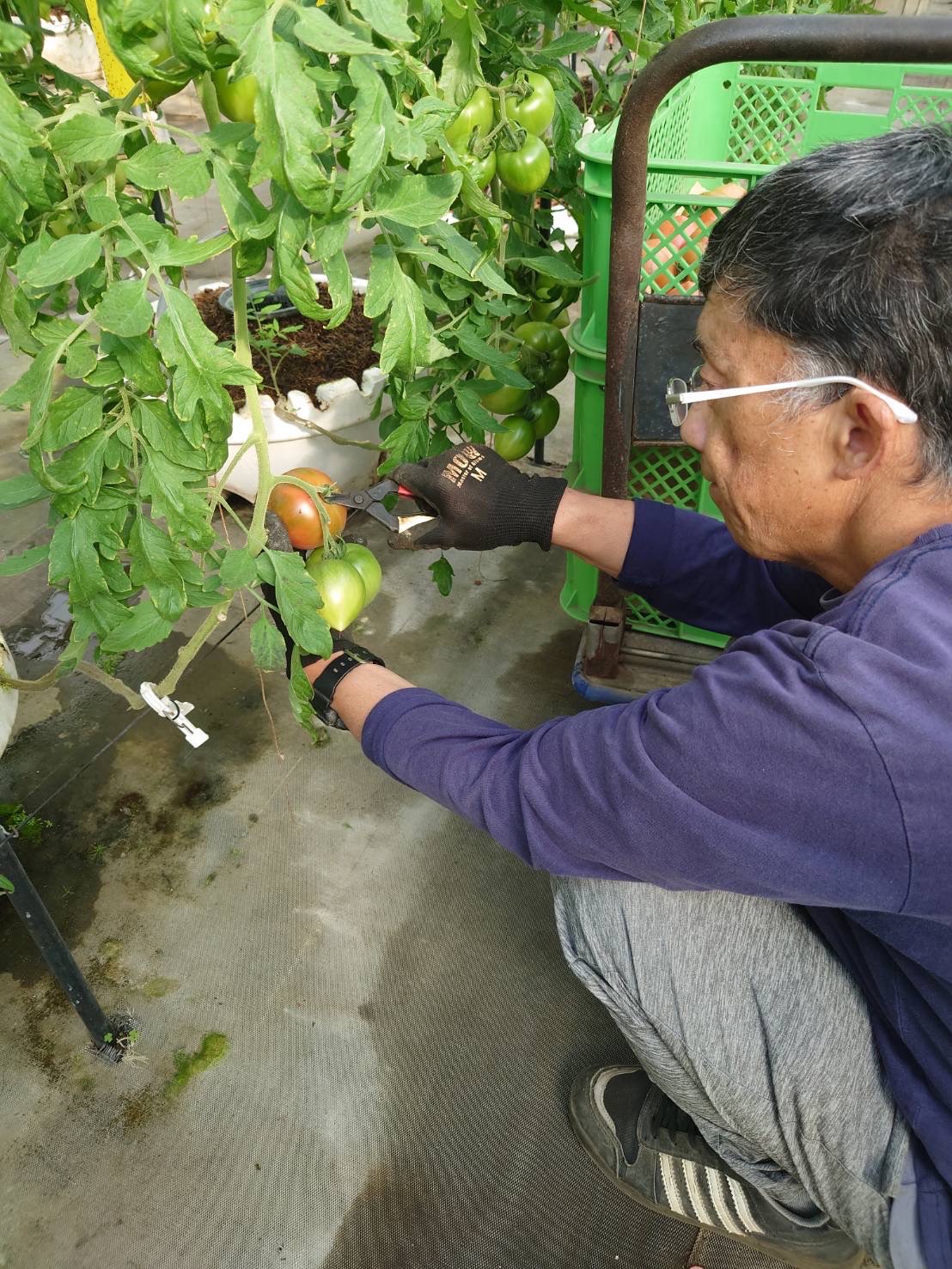 収穫に最適なトマトを選びながら、ハサミで丁寧に