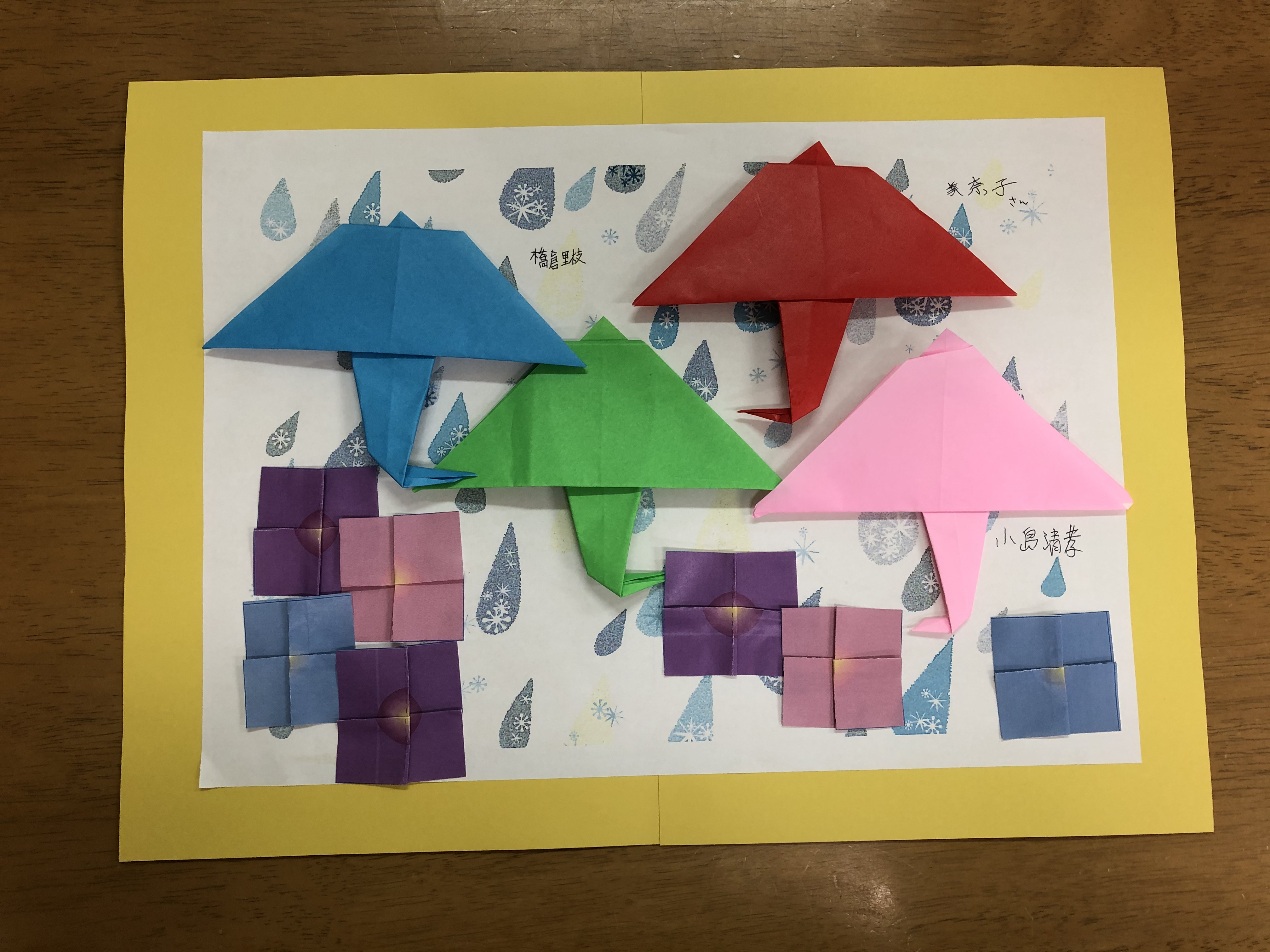 6月クラブ活動 6月11日(木)クラブ活動の様子です。 新型コロナ感染症対策と雨天のため一部クラブの内容が変更されました。 ≪美術クラブ (作品づくり)≫ 3種類の作品を作りました。みんな真剣です。 ≪太鼓クラブ (雨天のため活動室)≫ 雨天のため、室内の活動でしたが、太鼓の代わりに机でリズムを合わせました。 ≪ホームメイドクラブ≫ 満足のいく作品に仕上がったようです。 ≪華道クラブ (折り紙)≫ 梅雨の空を上手く表現されていて、素敵な作品が出来上がりました。
