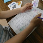 トマトの絵に色を塗って、1枚ずつ丁寧にはさみで切っています。