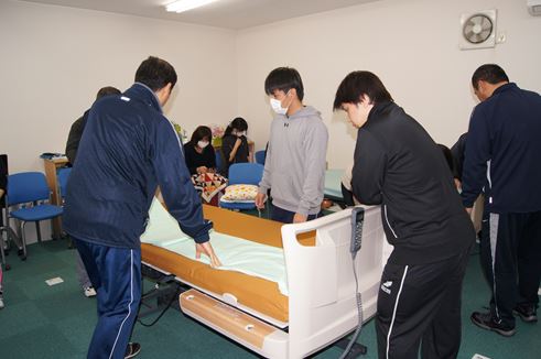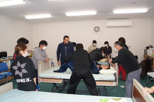 寝返り介助の授業もあり、みんな悪戦苦闘していました。
