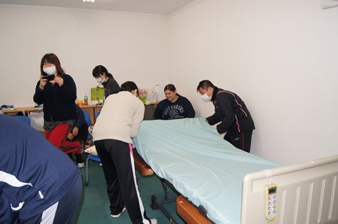 シーツのたたみ方、ひろげ方、三角コーナーの作り方などみんな真剣に取組んでいました。SONY DSC
