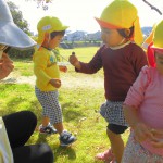 戸外は、温かく気持ちがよく散歩日和!!コスモスの花を見つけて「きれいなお花」「ピンクだ~」と教えてくれる子だもたち。公園では、どんぐりを見つけて「み~つけた!!」と元気な声やボール遊びをして”かして~”と手を広げるしぐさが成長を感じさせてくれました!(^^)!