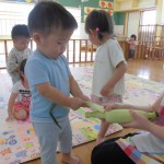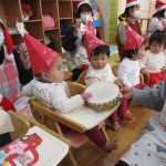 今月の誕生会は、芋ほりのペープサートを見た後に、みんなで芋ほりごっこを行いました。