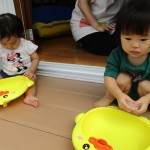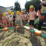 実りの秋ということで、園庭でお芋ほりごっこをしました。砂をかき分けていくと何か固いものが!!「あれ?」と不思議そうな表情をしてさらに掘り進めると、、、