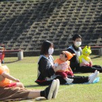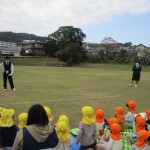 地震を知らせる職員の拡声器のサイレンにびっくりする子ども達もいましたが、防災頭巾を被って、みんなで平和が丘公園に避難することができました。