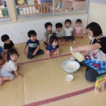 粉を触って感触を確かめたり、お団子みたいにまるまる~と丸めてみたり、みんな喜んで作ってくれました。