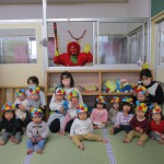 もみじ組(0歳児)は、鬼とこっそりハイチーズ!!すみれ組(1歳児)とひまわり組(2歳児)は鬼の登場にびっくり!!!ボールをまめに見立てて投げて鬼退治を頑張る子ども、怖くて先生の側から離れない子ども。大きな声を出して「あっちいって~!」と…色々な姿が見られました。