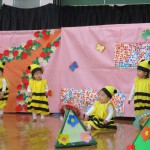 もみじ組(0歳児)は、保護者を見つけて客席へ行きたがり、自由にあっちへこっちへ動き回り普段の様子が見られました。すみれ組(1歳児)はいつもと違う様子に固まる子どももいれば「ママ―!」と手を振ってちょっぴり余裕。ひまわり組(2歳児