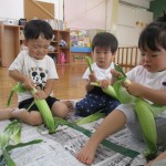食育で食べる前の野菜の姿を知り、どのような形なのかを知ることで食べ物への興味を引き出しています。今月はとうもろこしの皮むきに挑戦!!