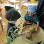 お月見のパネルシアターを見た後に、秋の果物や野菜をお供えして団子作りがスタート!