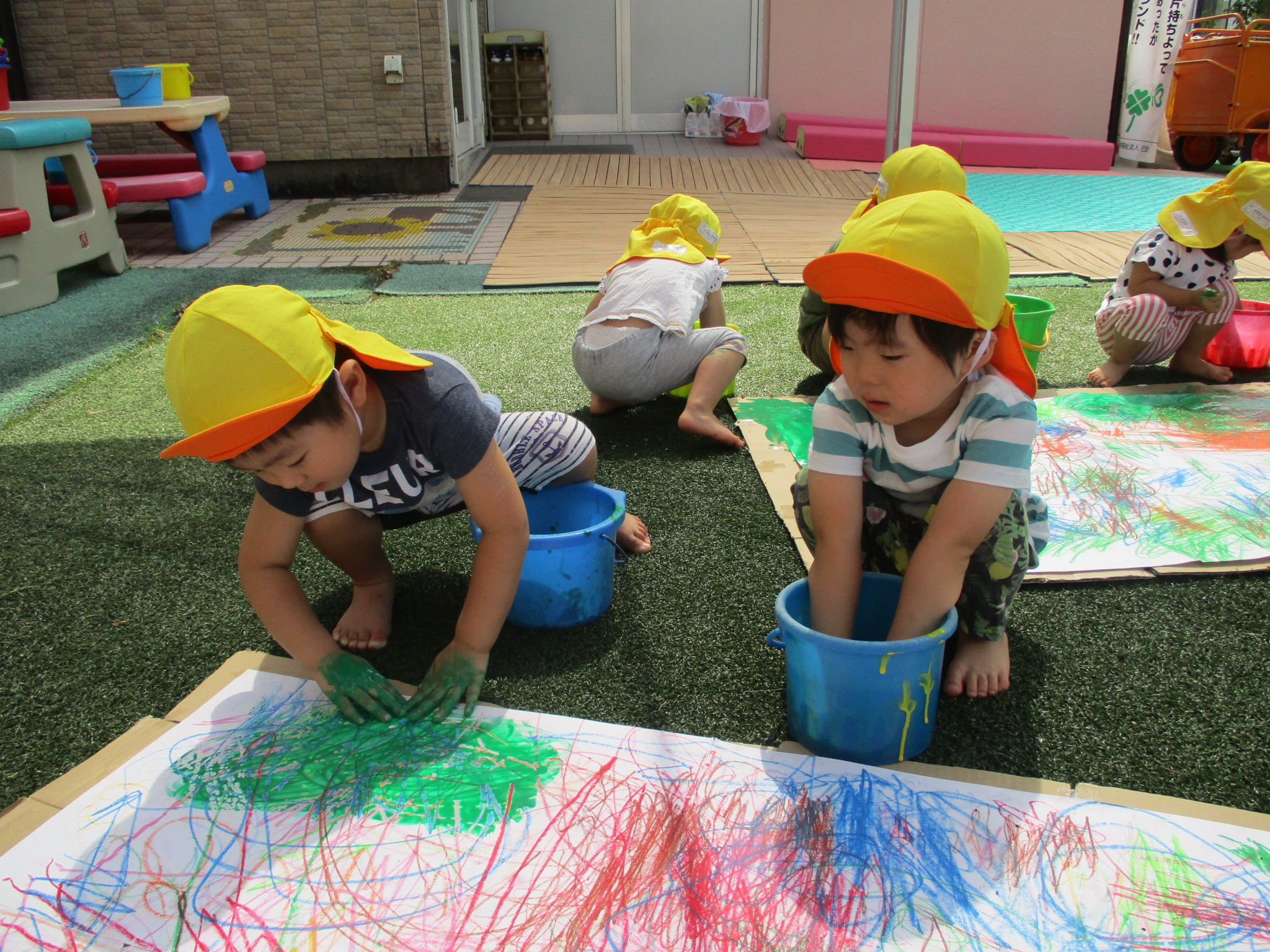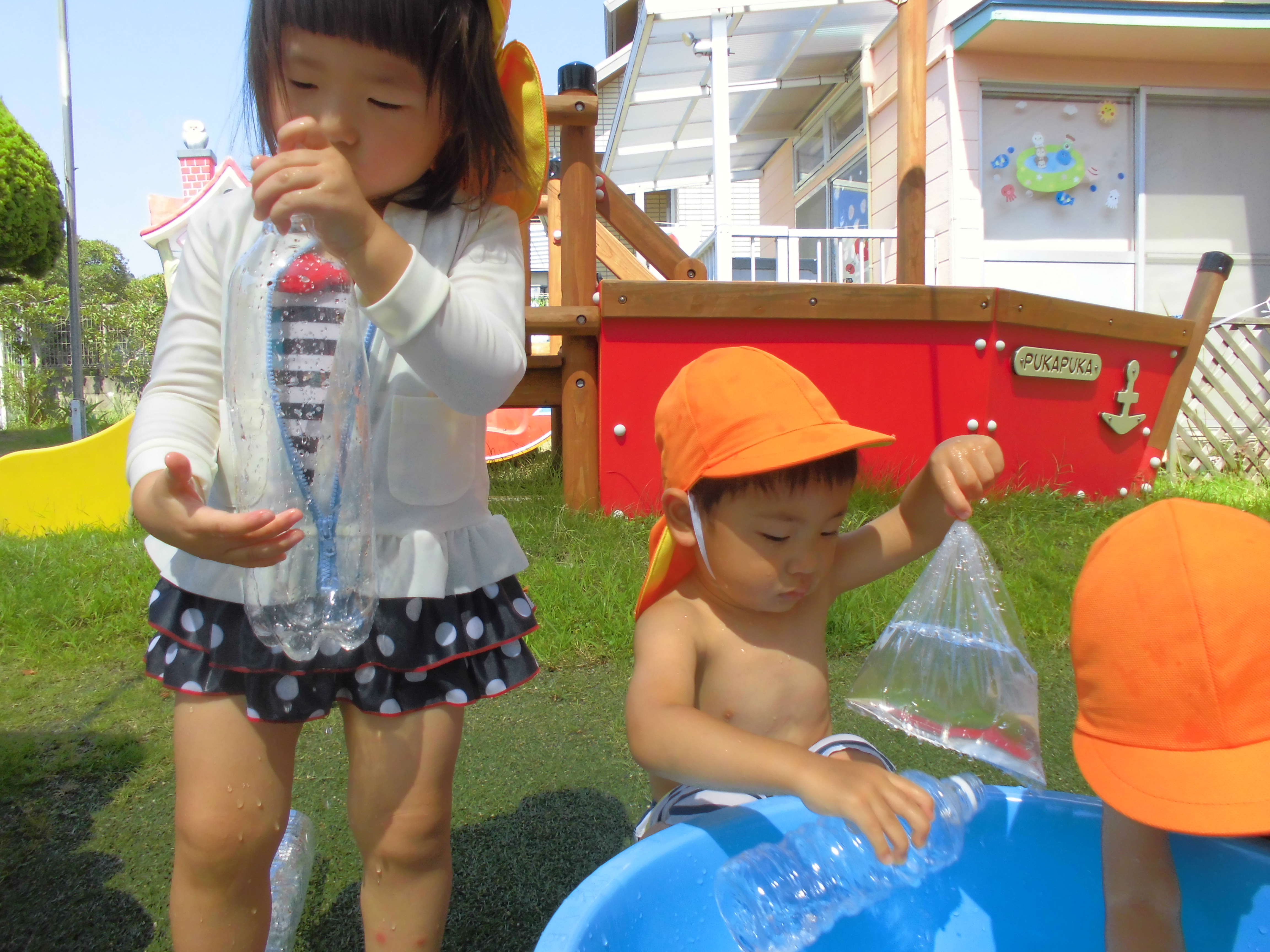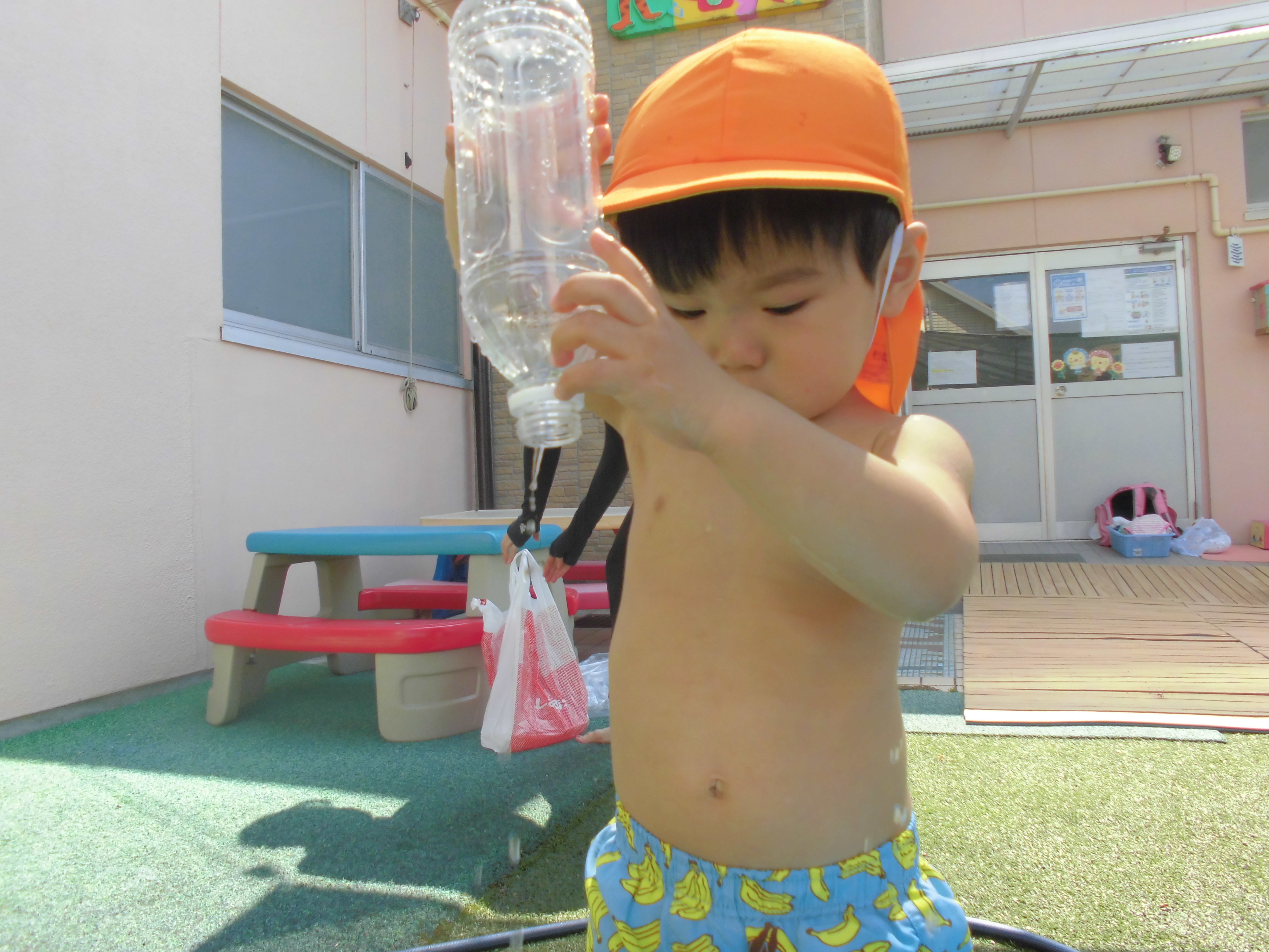 R2 8月 水遊び 今年はプールではなく水遊びでの活動となりました。子どもたちが水に触れ、楽しさや冷たさ、気持ち良さを感じられるよう様々な活動を取り入れました!! 自分たちで作ったペットボトルのじょうろに「じゃ~」っと水を入れたり、氷に触れ「つめた~い!」と大喜びする姿が見られました(*^_^*)❤ 他にも絵の具での色水遊びや泥んこ遊びなどのびのびと遊び、暑い夏を楽しむことができました!