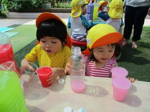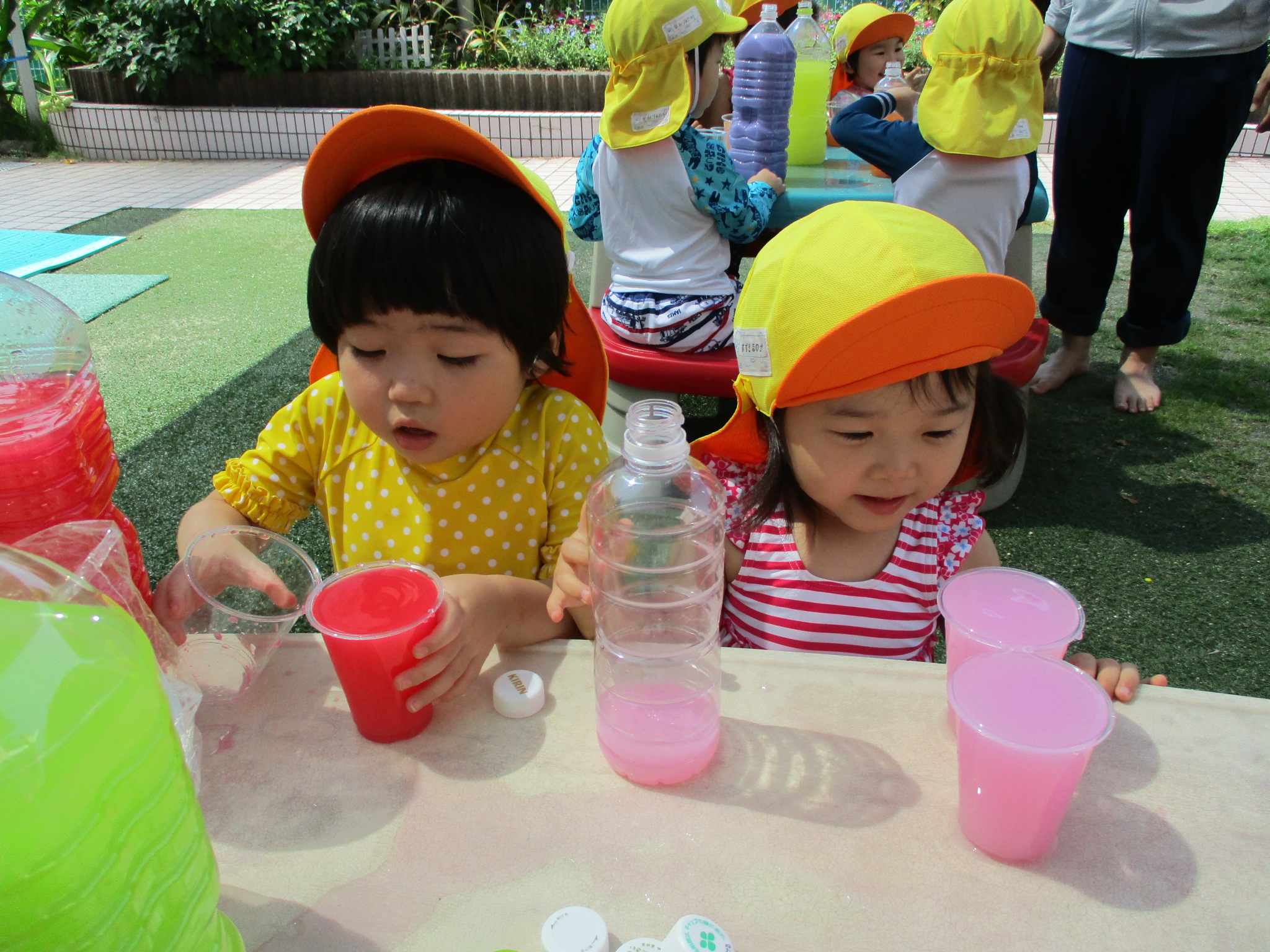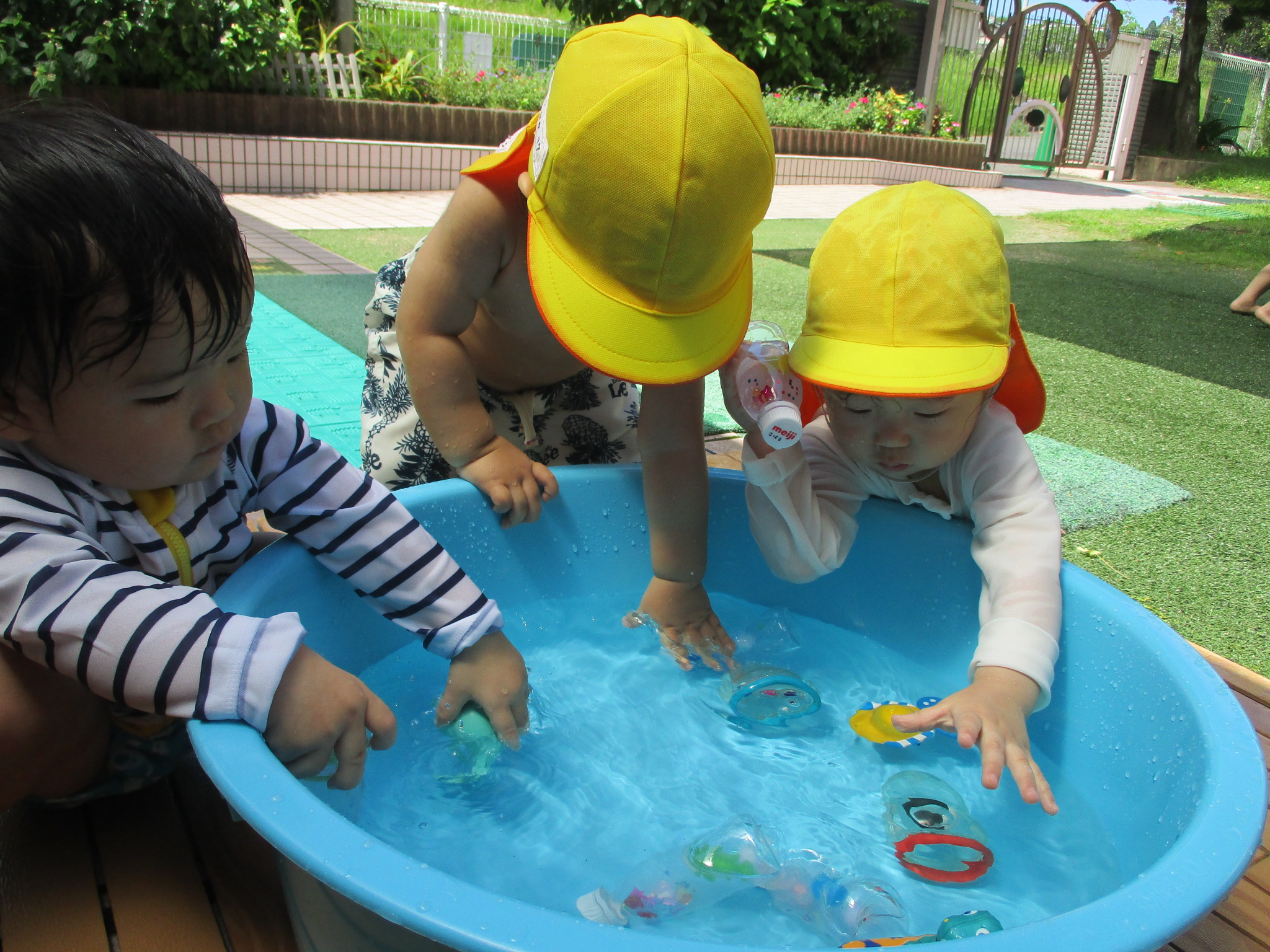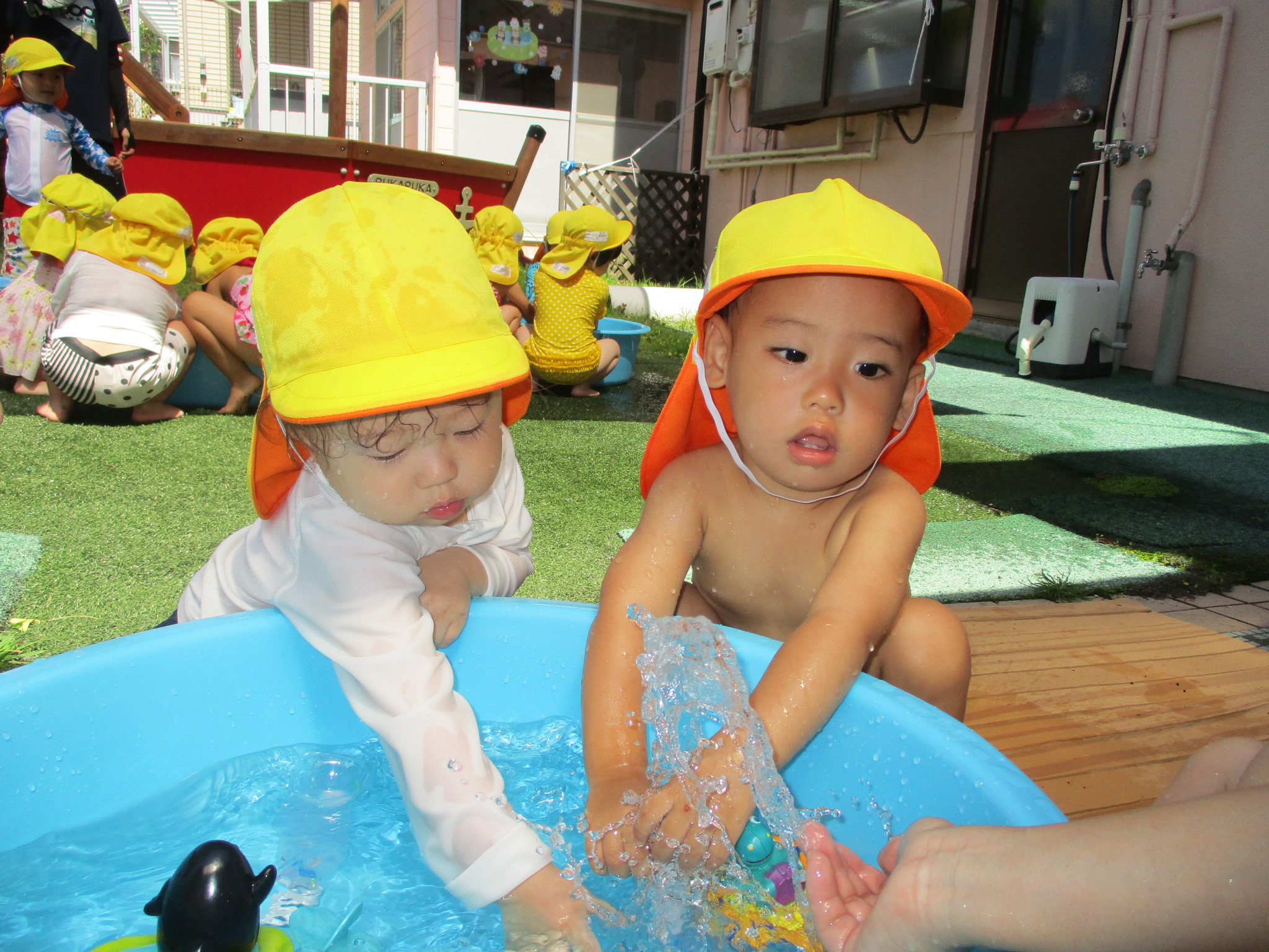 R2 8月 水遊び 今年はプールではなく水遊びでの活動となりました。子どもたちが水に触れ、楽しさや冷たさ、気持ち良さを感じられるよう様々な活動を取り入れました!! 自分たちで作ったペットボトルのじょうろに「じゃ~」っと水を入れたり、氷に触れ「つめた~い!」と大喜びする姿が見られました(*^_^*)❤ 他にも絵の具での色水遊びや泥んこ遊びなどのびのびと遊び、暑い夏を楽しむことができました!