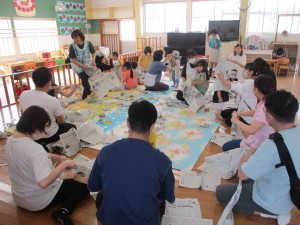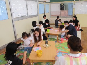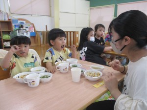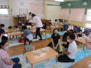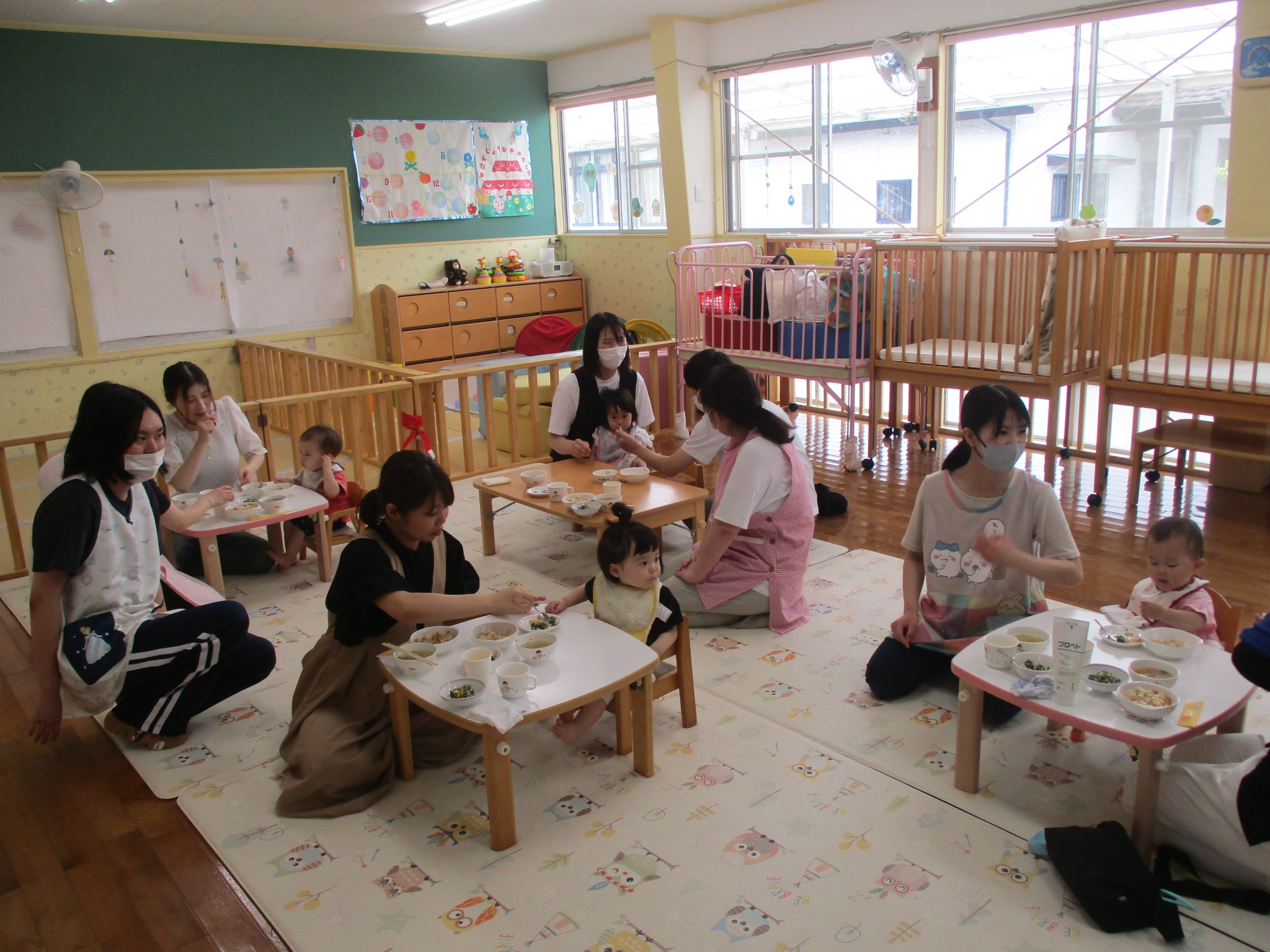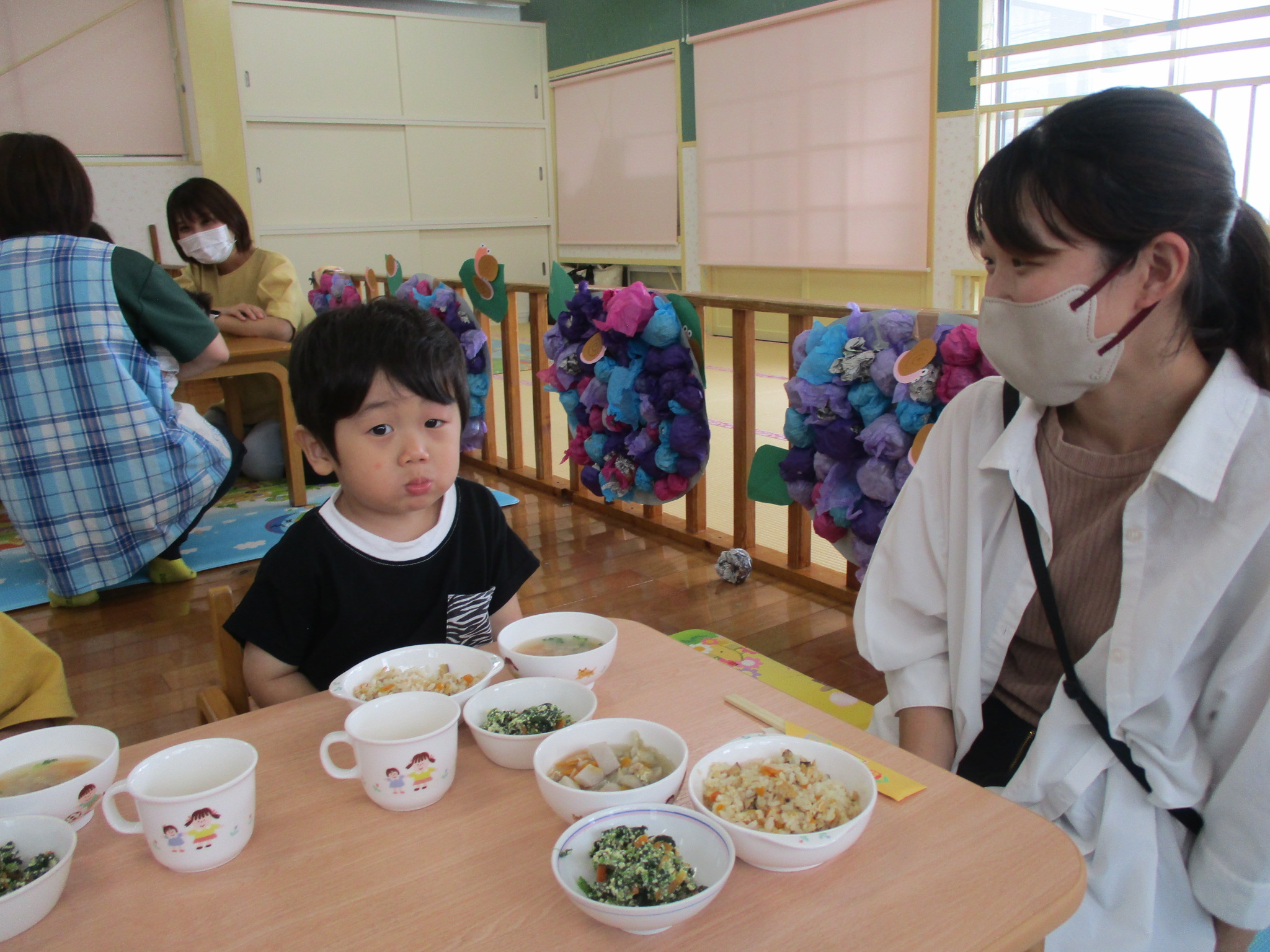 6月 参観日 参観日は、2歳児・新聞紙あそび、1歳児・うちわ作りをして親子で楽しく過ごしました。 0歳児さんは廊下から普段の子ども達の様子を見てもらい、家庭とは違う子ども達の姿に「成長を 感じます」という声が聞かれました。 給食は、試食会も兼ねて日ごろの給食を食べてもらいました。よく食べてくれる子ども達に、びっくりされている保護者の方もいました!