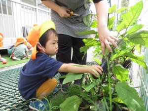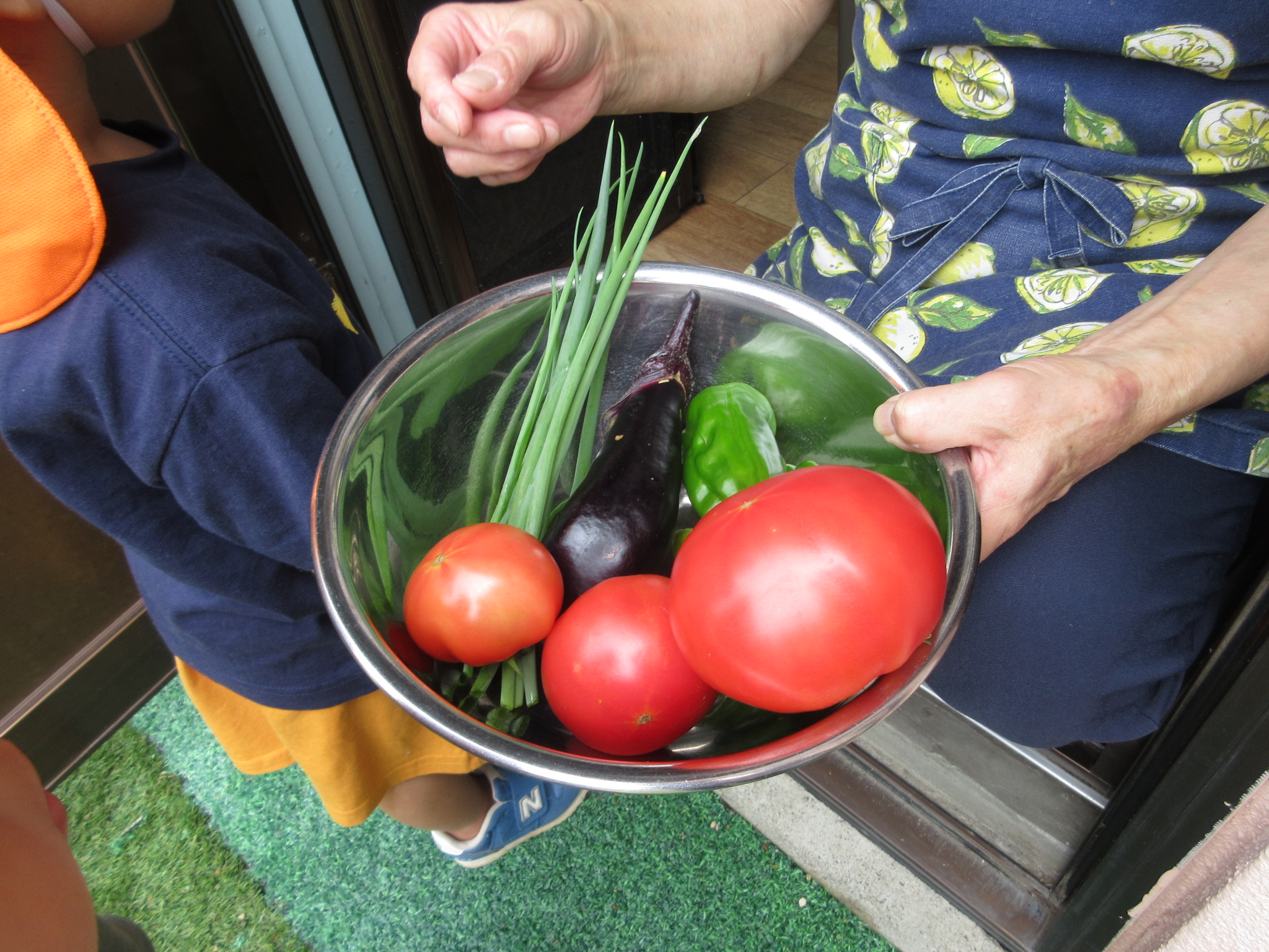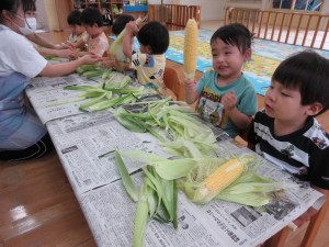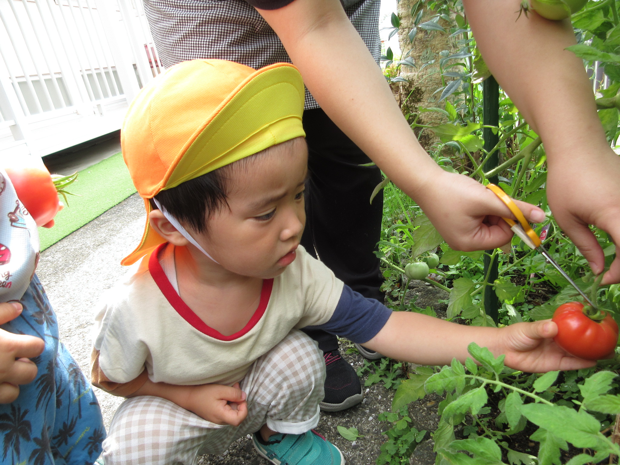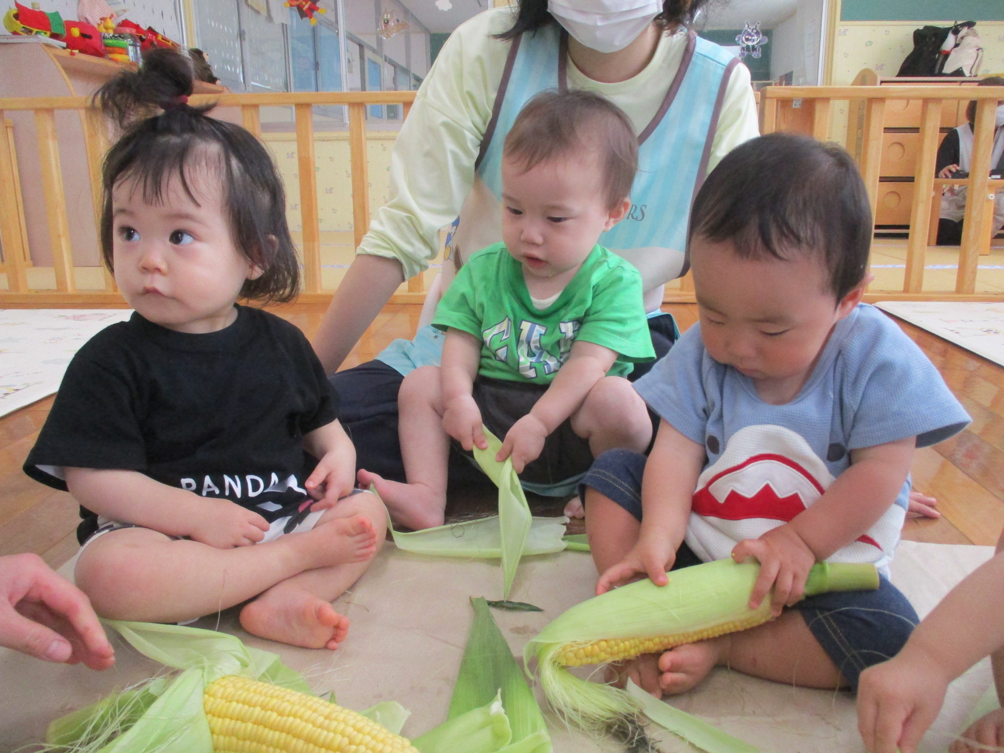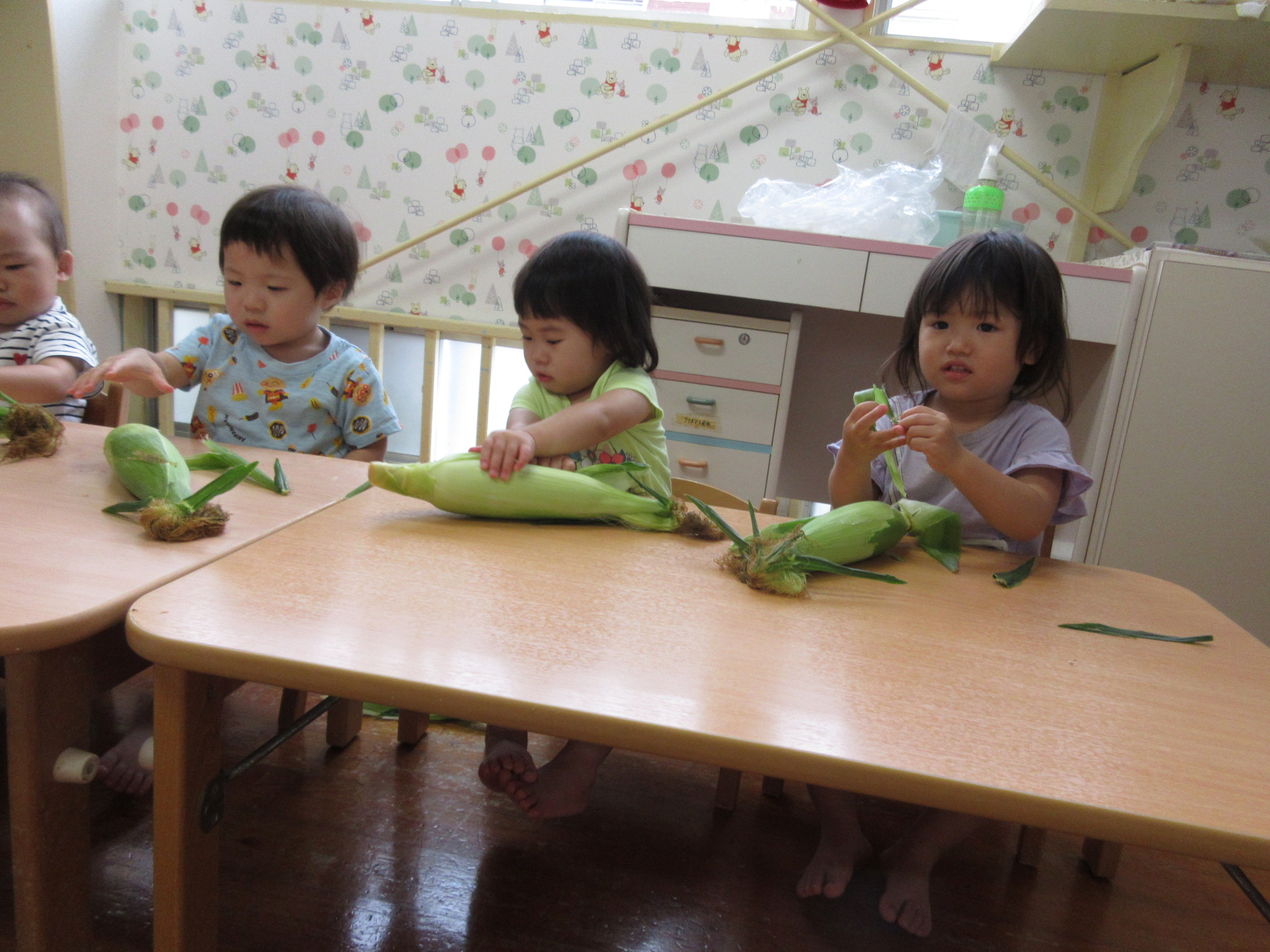 6月 食育 4,5月に植えた野菜が大きく実り、2歳児のひまわり組さんが収穫をしました! トマト・ナス・ピーマン等々たくさん採れて、給食の添え野菜などに出してもらいましたよ。 また、毎週水曜日に『トウモロコシの皮むき』をしました。 始めはチョッピリ触るのが苦手だった子どもも、最後には自分から触れるようになって勢いよく 皮をむく姿も見られました。