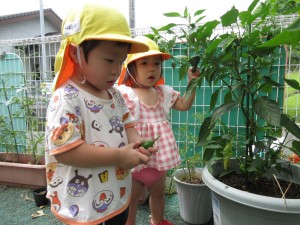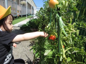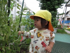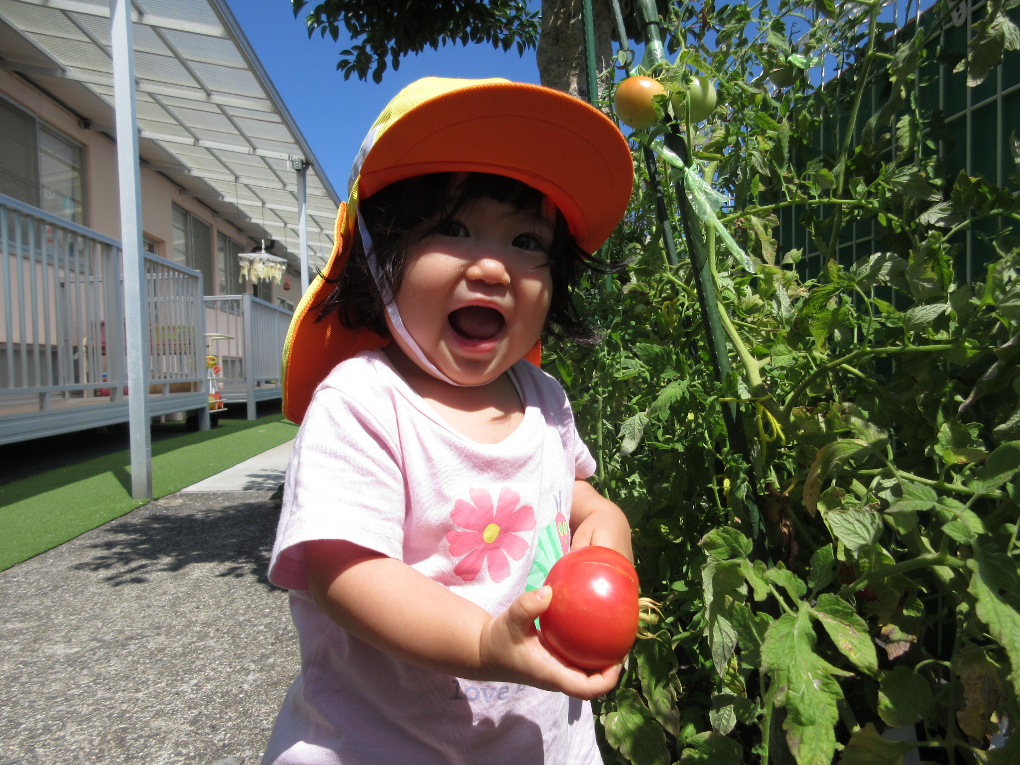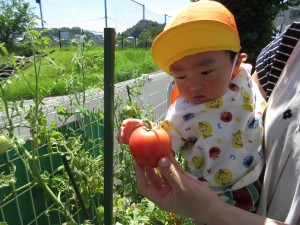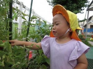 赤くなったトマトやピーマンを取って不思議そうに見つめたり、満面の笑みを浮かべて喜んでいました。