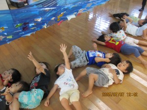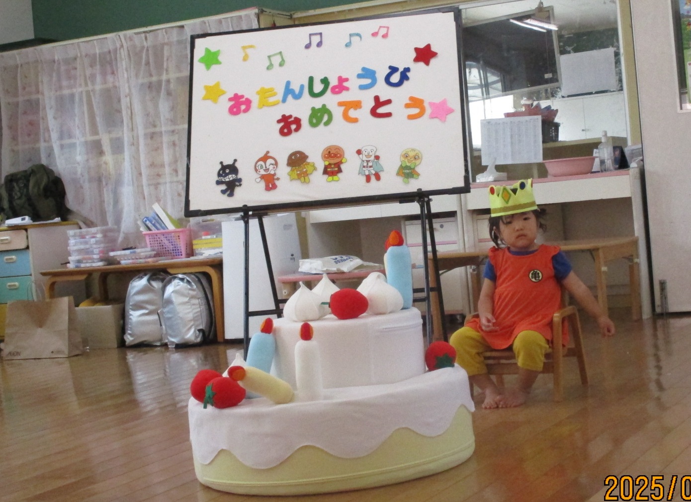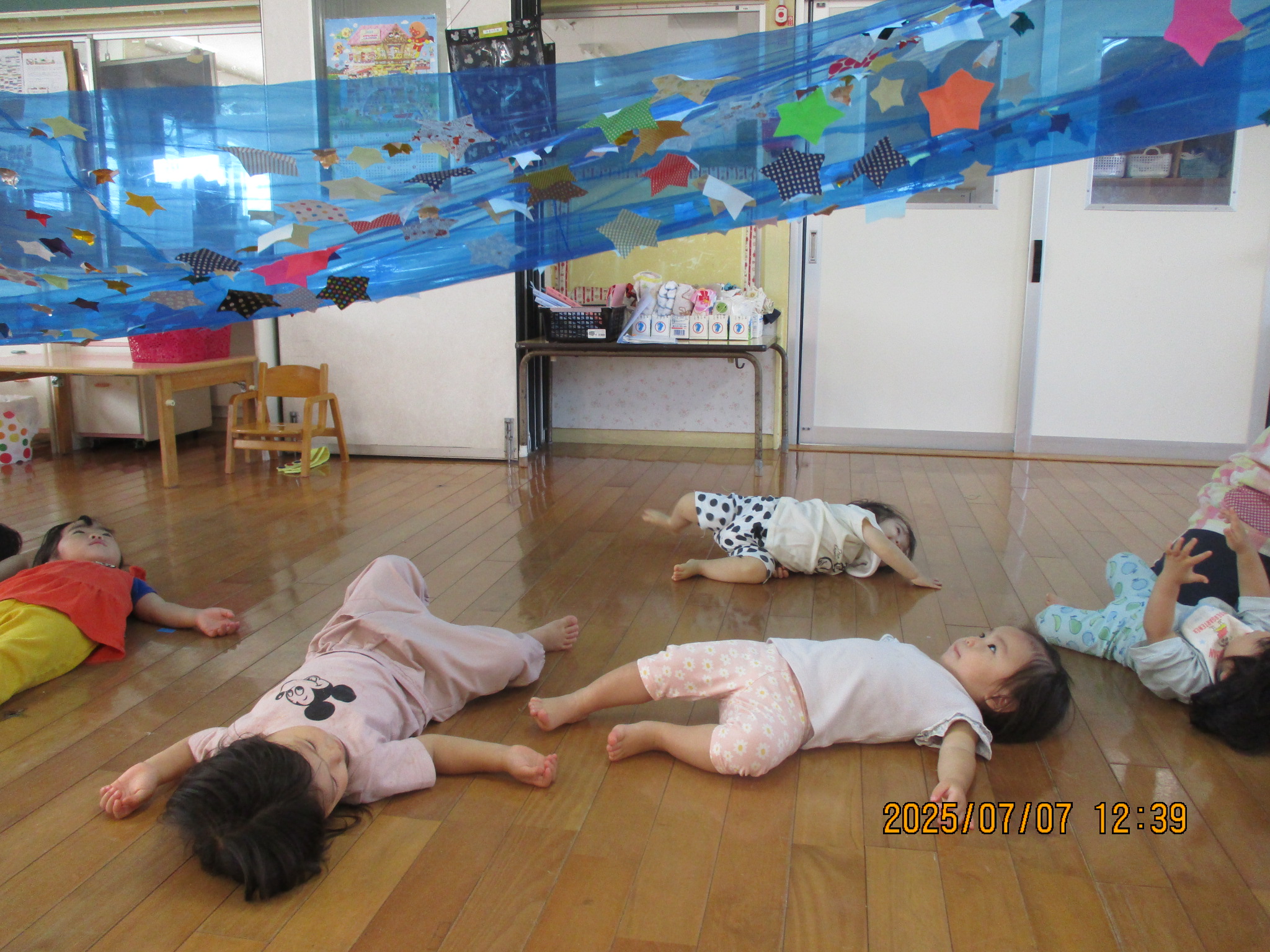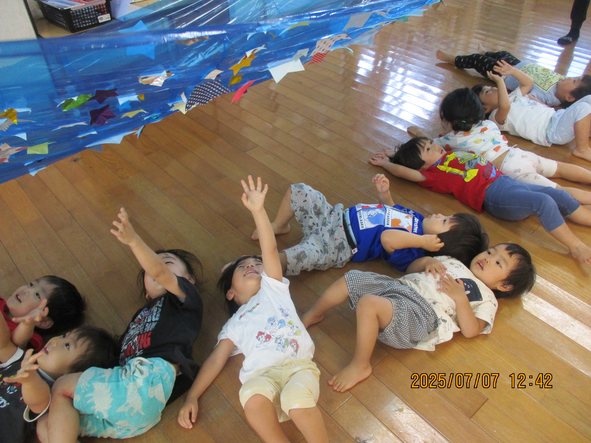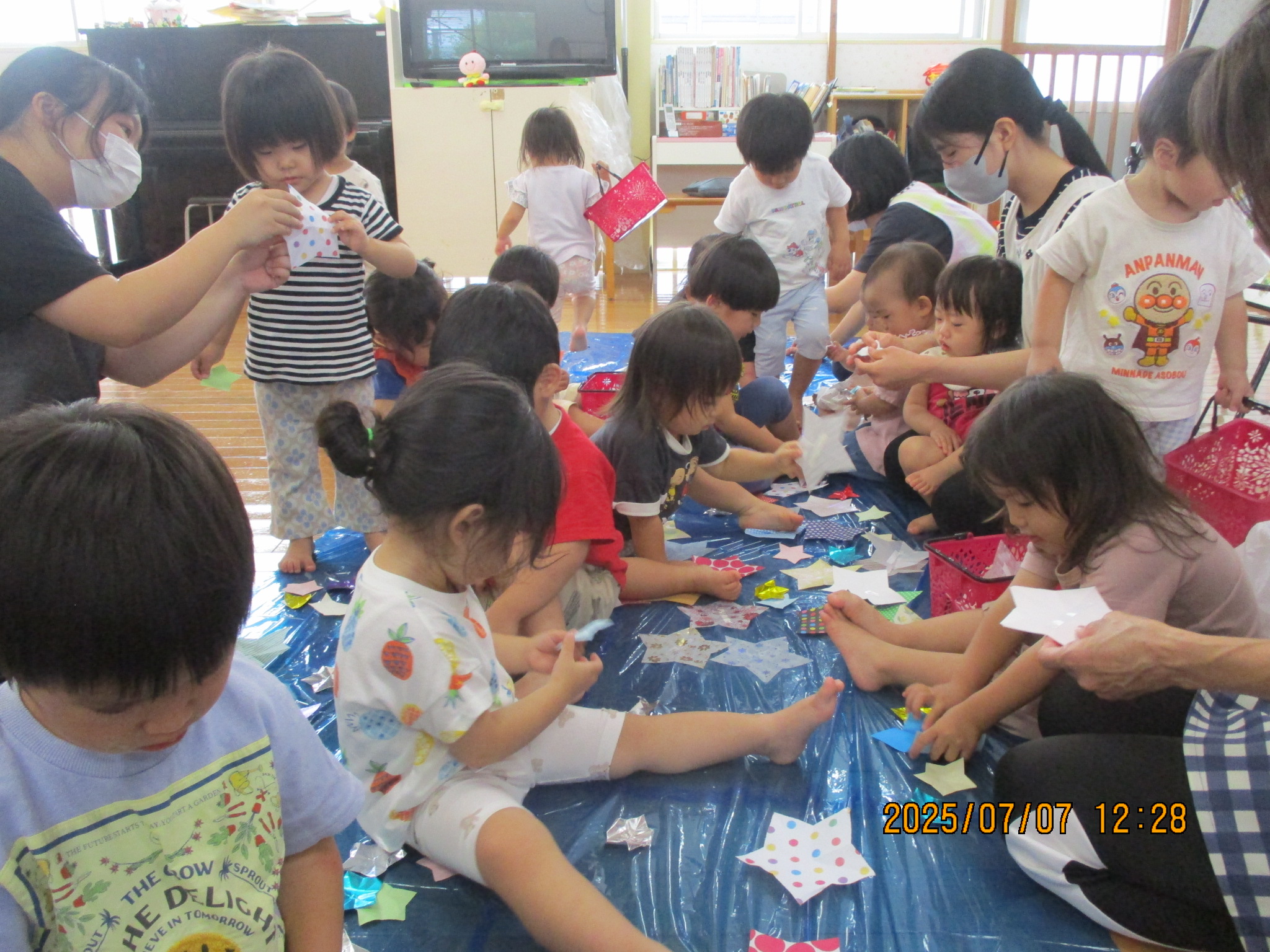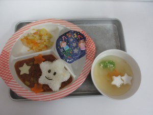 7月 誕生会 7月の誕生会は七夕まつりの日に行われました。 誕生者をみんなでお祝いして、そのあとは七夕の由来を簡単にペープサートで見て、みんなで天の川を作りました。キラキラお星さまの色紙をたくさん貼って、素敵な天の川が出来上がりました! 楽しみにしていた給食は『ドライカレー』。たくさん星が入っていて子ども達は「ここにもあるー」と、口々に言いながら食べていました。おやつの『ココアケーキ』もあっという間に完食しました!