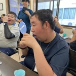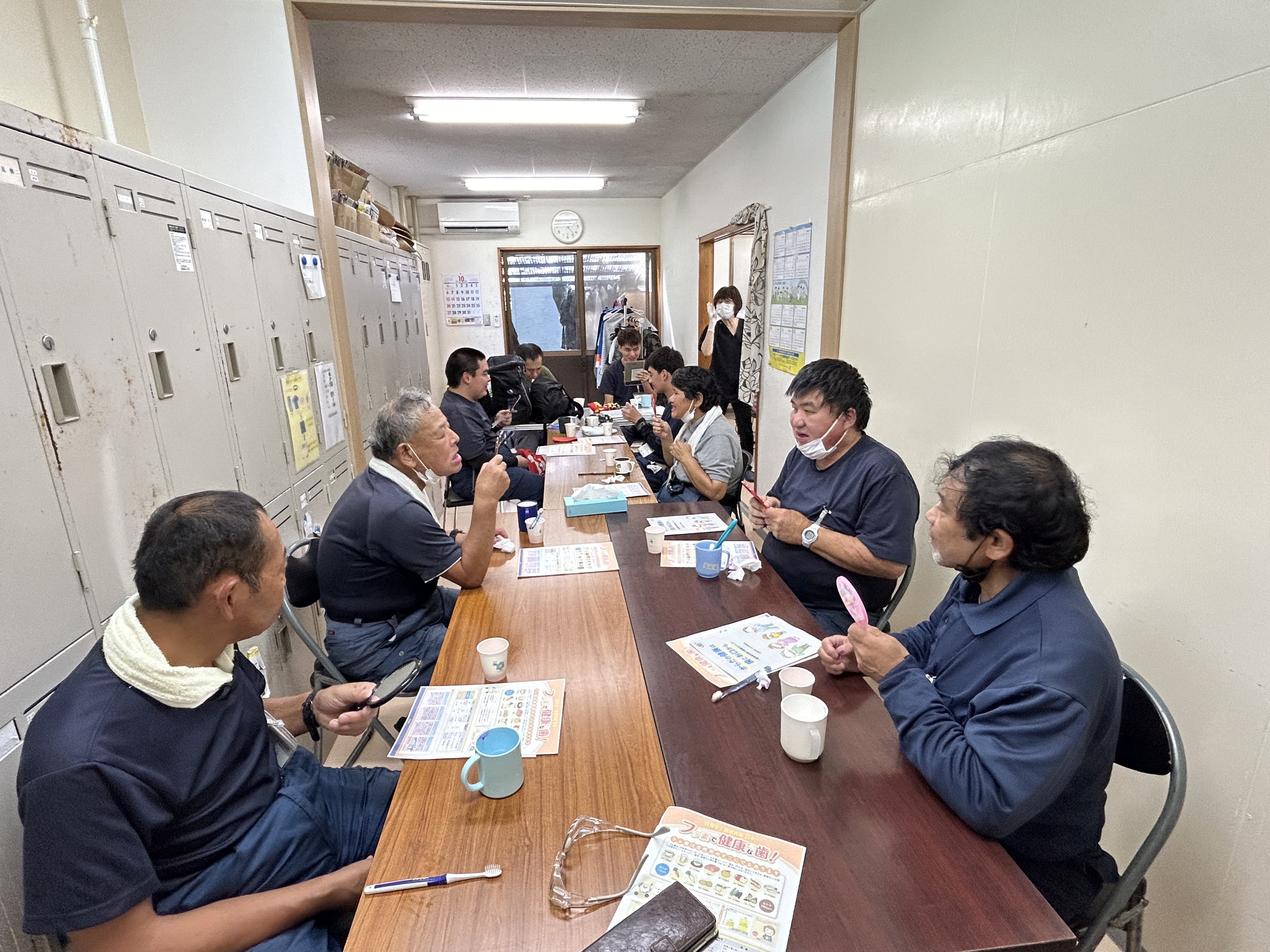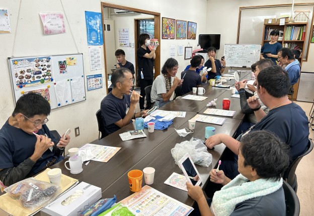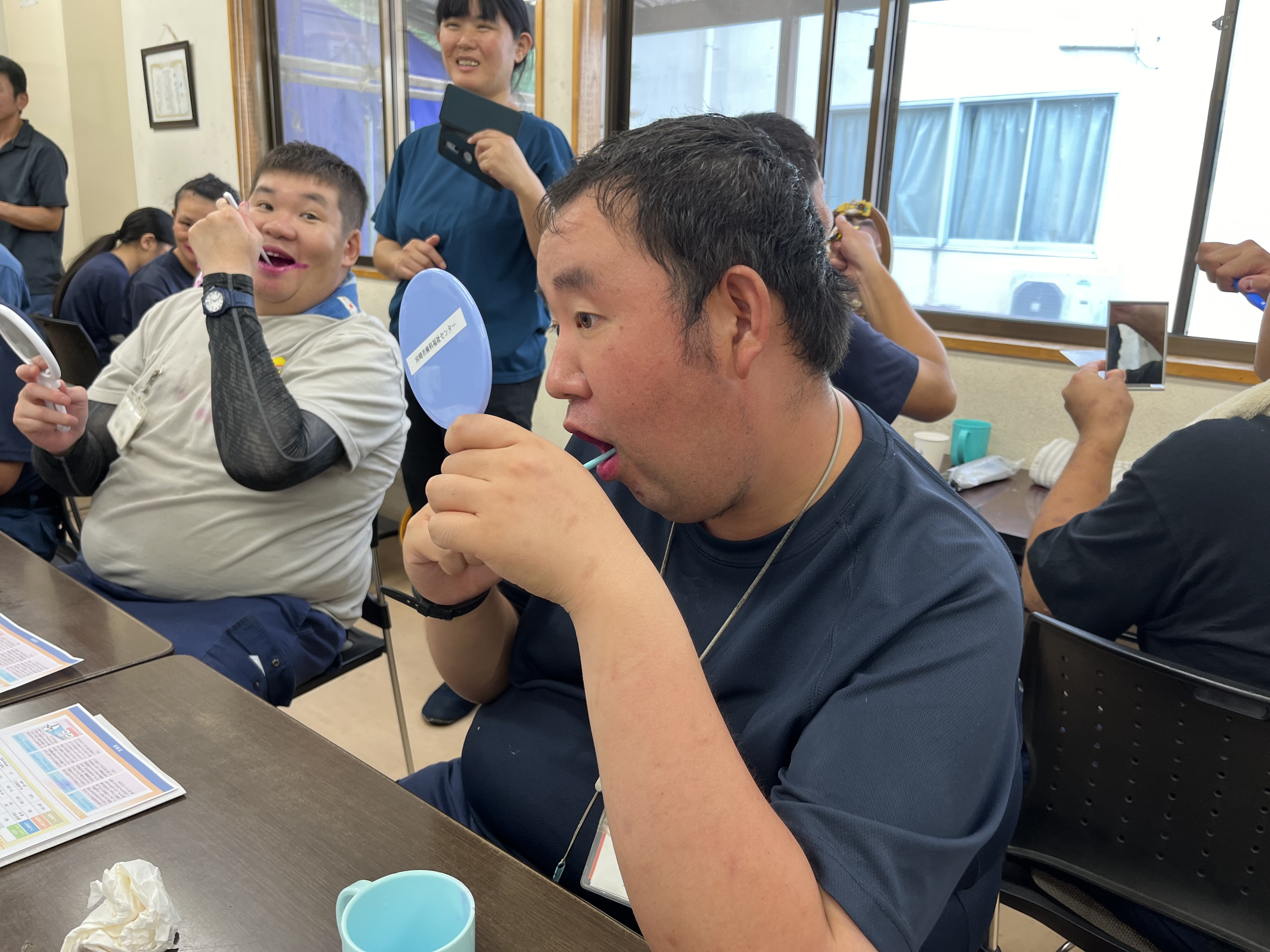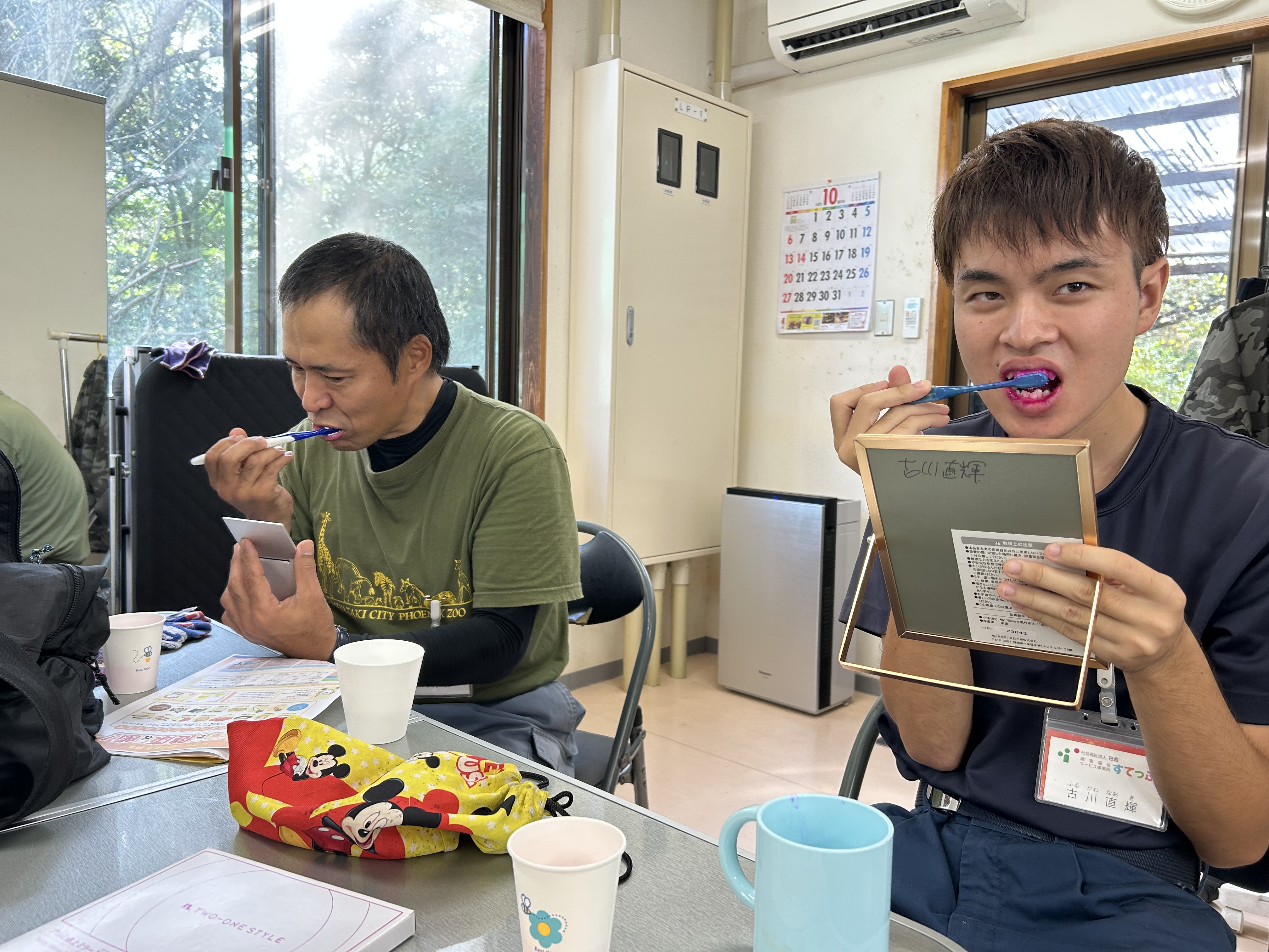 ブラッシング指導 10月23日(水)宮崎市口腔保健支援センターの職員が来所され、歯磨きの方法や注意点、歯磨きを怠ることでのリスクなどの話しを、模型を使用してもらいながらわかりやすく説明してもらいました。ご利用者の皆様もたくさんの質問をされ有意義な時間となることができました。