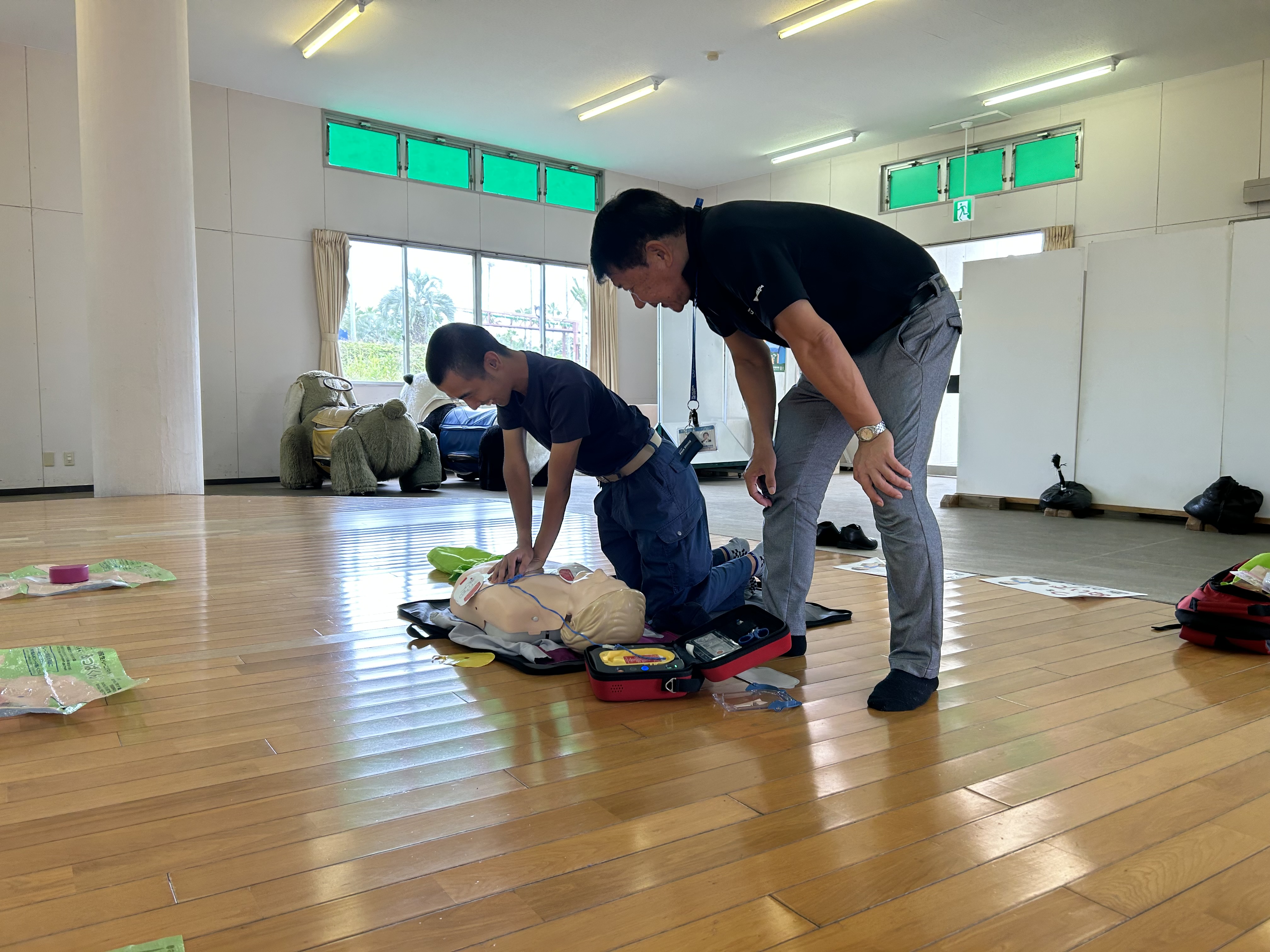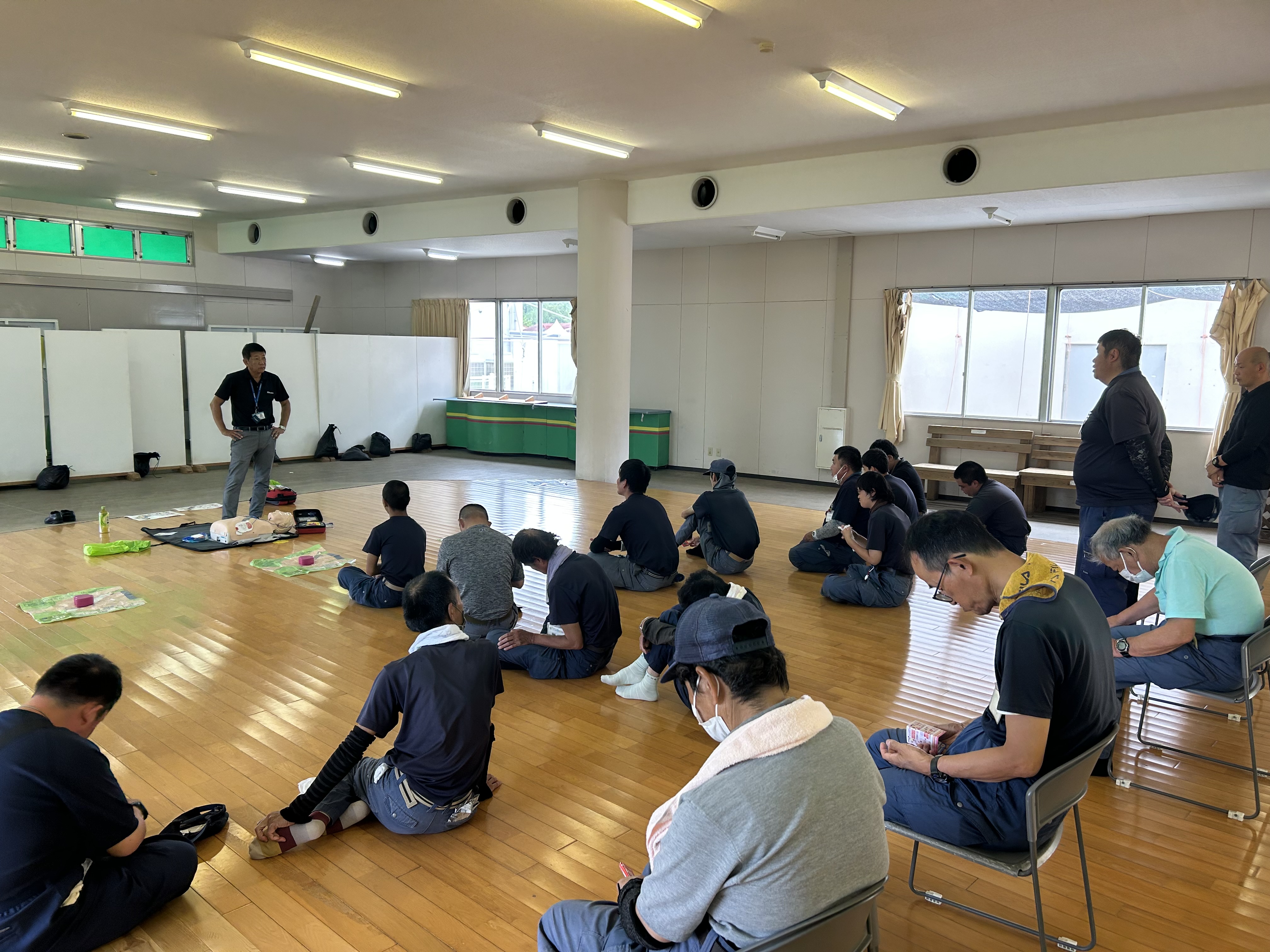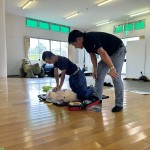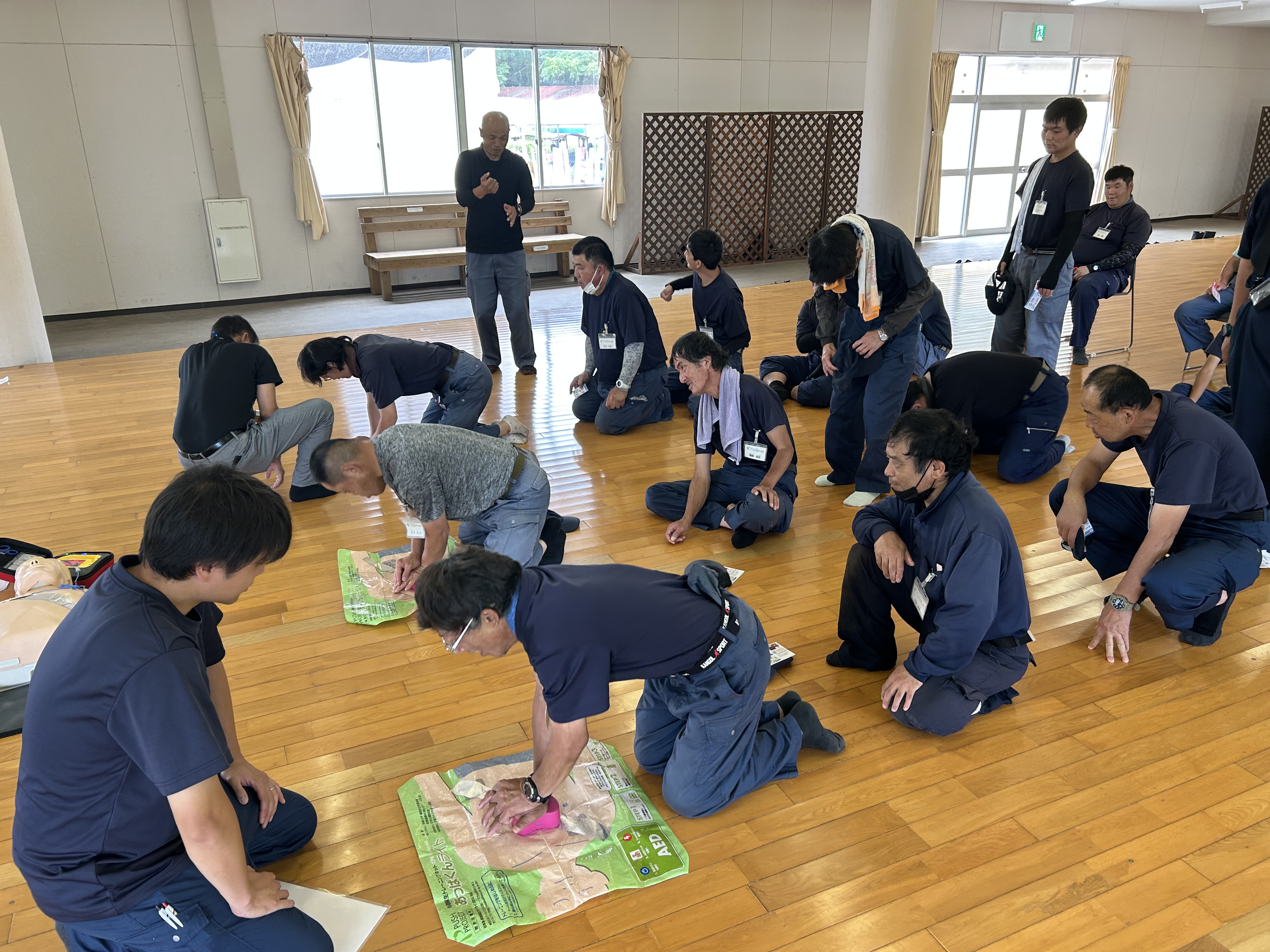 AED講習 6月25日(水)に年に1回のAED講習がありました。フクダ電子から講師に来ていただき、胸骨圧迫の方法やAEDの使用方法などを詳しく教えて頂きました。最後の質問する場面では、たくさんの質問があり参加された皆さん積極的に取り組まれていまいた。
