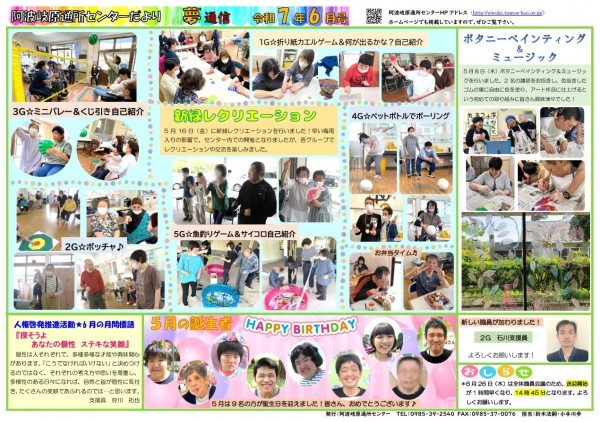 新緑の季節を迎えました! 5月16日、新緑レクリエーションを行いました!あいにくのお天気となり、室内での開催となりましたが、保護者の方にもご参加いただき、各グループでのレクリエーションや交流を楽しみました! 5月8日、初めての試み“ボタニーペインティング&ミュージック”があり、葉っぱに色を付けてみんなでアート作品を作ったり、ウクレレに合わせて楽器や歌を楽しみました♬