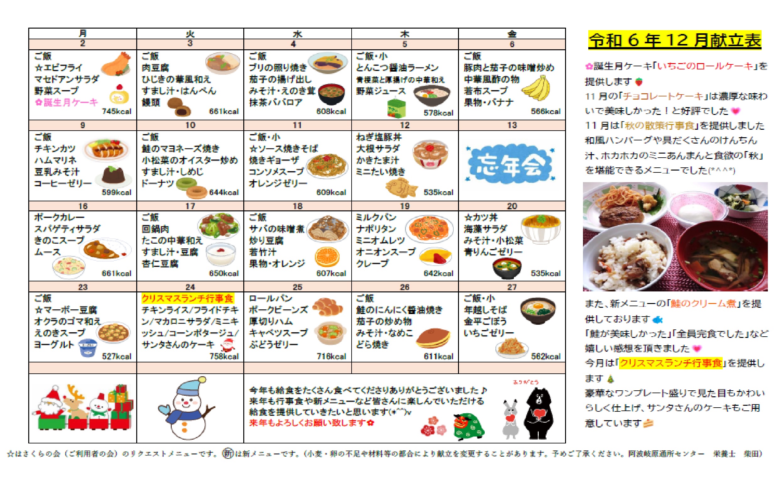 11月の新メニューは『鮭のクリーム煮』でした!!少しずつ寒くなってきたので、暖かいシチューは最高のおかずでした!!12月はクリスマスランチ行事食です(#^.^#)楽しみですね!!