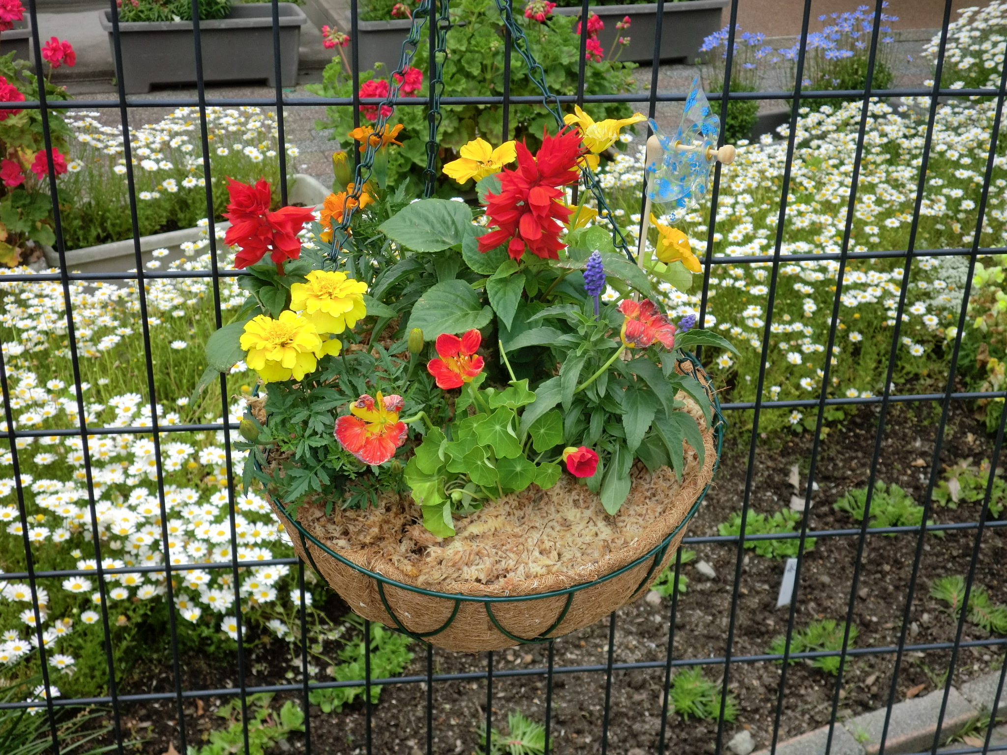 ハンキング・バスケットを作りました。 地域活動支援センターⅡ型(8グループ)で市民の森で開催された『ハンキング・バスケット作り』に参加しました。土入れや苗のセット・コケを貼る作業をみんなで分担してかわいいバスケットが完成しました。作品は東側玄関フェンスに飾っていますのでご覧ください。