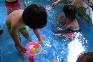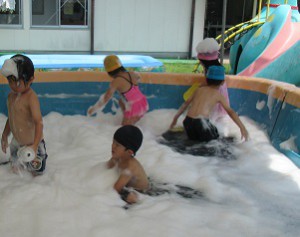 子ども達が大好きな水遊びでは、プールにおもちゃを入れて宝探しをしたり、泡あわにしたりと、たくさん遊びました。次の夏もた~くさん水遊びをしたいなぁ・・・。