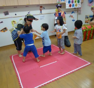 お楽しみ会では、海賊と戦ってお宝をゲットしたり、光遊びをしたり、花火を見たりとたくさん楽しみました。