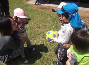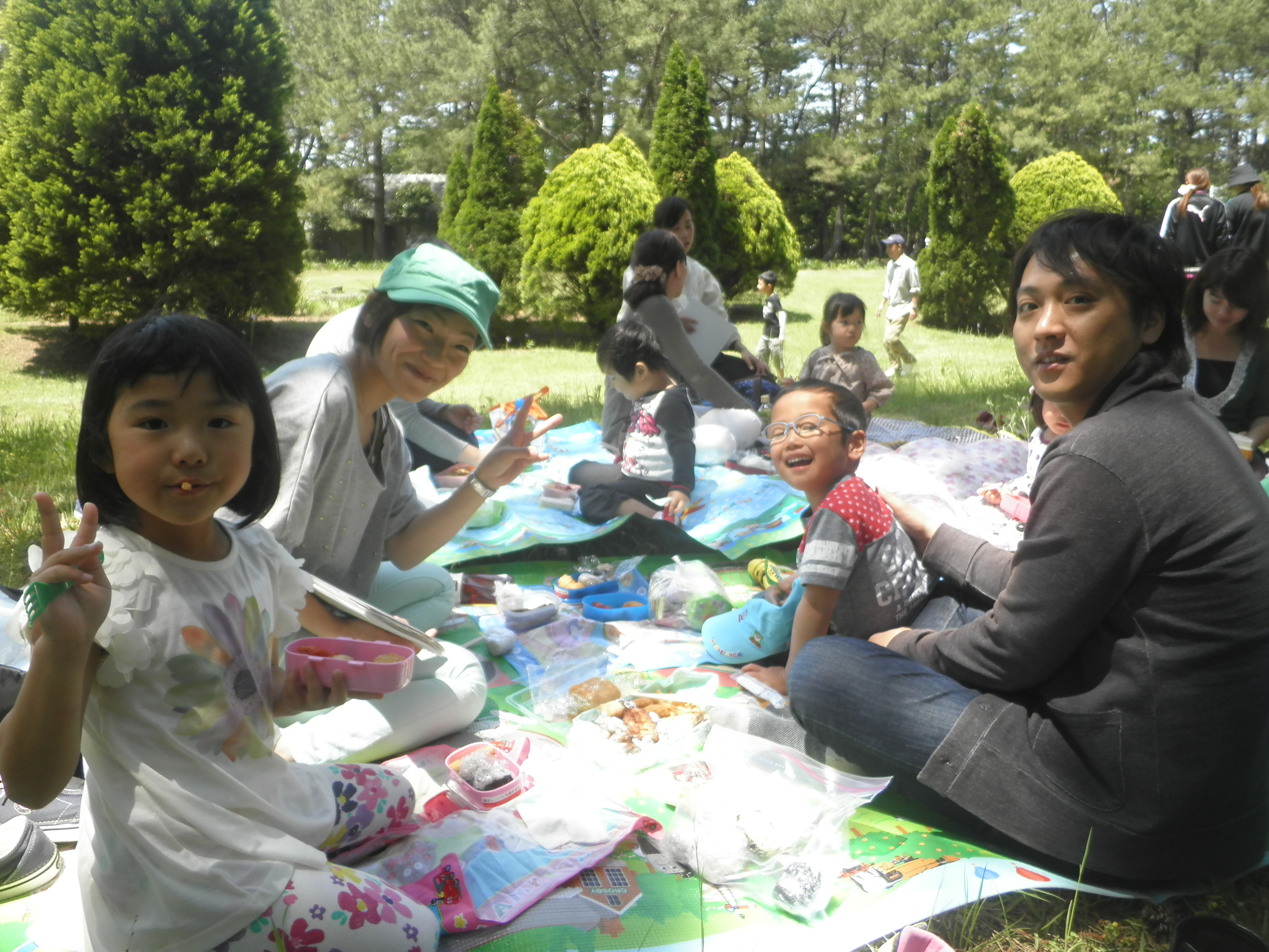この後は、みんなで仲間集めゲーム、バルーン遊びをしました。 たくさん遊んだ後は、家族と一緒においしいお弁当の時間。外で食べるお弁当は、とってもおいしいですね。この後は、みんなで買いに行ったおやつを食べたり、追いかけっこをして遊んだりと、時間いっぱい元気に遊びました。