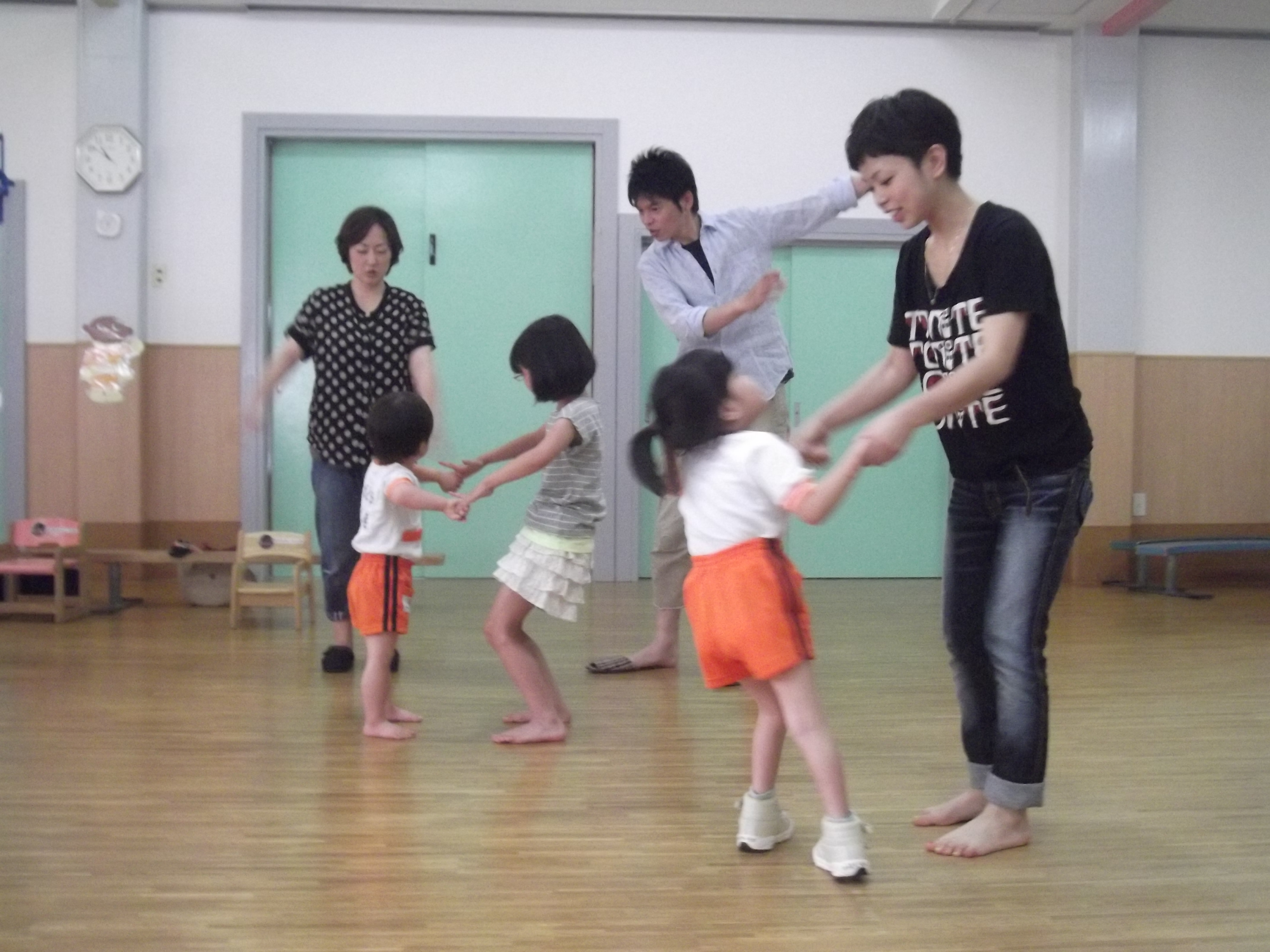 さくら組では、親子でさくらんぼリズムをしました。大好きなお父さんやお母さんと一緒にピアノの曲に合わせて「とけい」や「きんぎょ」、「とんぼ」になって、体をたくさん動かしました。