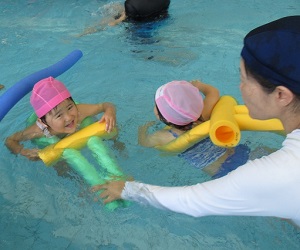 スイミングでは、ボランティアの学生さんと一緒に水遊びを楽しんでいます。