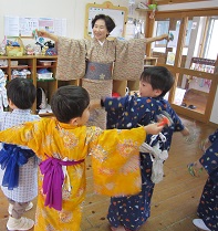 日舞では、最初は緊張した表情を見せていた子ども達も、慣れてくると好みの浴衣の争奪戦になることも。