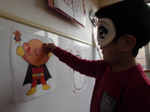 子ども達は、鬼のお面をかぶったり、新聞紙で作ったボールを持って鬼退治!!