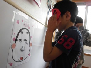 いろんな”福笑い”に挑戦。アイマスクをしている子ども達の姿も、ちょっぴり変顔になっています。