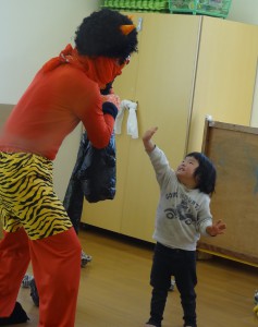 鬼が来るまでは、「ぜんぜんこわくないし~」「やっつけてやる~」と言っていた子ども達も、目の前に鬼がやってくると・・・・「たすけて~」「いやだ~」「せんせい・・・・」の声と、泣き声が。
