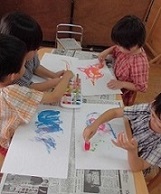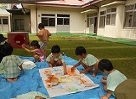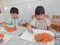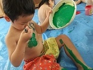 クレヨンや絵の具でのお絵描き。筆だけでなく、ローラーも使います。夏には氷遊びの延長で、絵の具で色をつけた氷を使ってお絵描きをしたクラスもありました。夏空の下でボディーペインティングを楽しむ姿もたくさんみられましたよ。