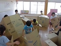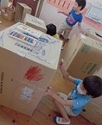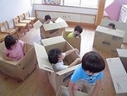 段ボール箱がい~っぱい。さてどうやって遊ぼうかな?まずは箱を広げてみたり、中に入って見たり・・・。箱に入って電車ごっこのように並んだり、窓を作ってお家にしてみたり。お絵描きもしてみよう!!子ども達ならではの発想は面白いですね。