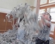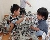 子ども達と一緒にちぎった新聞+事前に準備した新聞を合わせると、部屋中が新聞紙だらけに。両手いっぱいに新聞紙を持って、上に投げたり、お腹や背中に入れ込んだりと、様々な遊び方で楽しみます。大きく繋げた新聞紙のトンネルをくぐったり、やぶったり。最後はビニール袋に入れて、大きな新聞紙ボールの出来上がり。ボールで遊んだら、お片付け終了!!